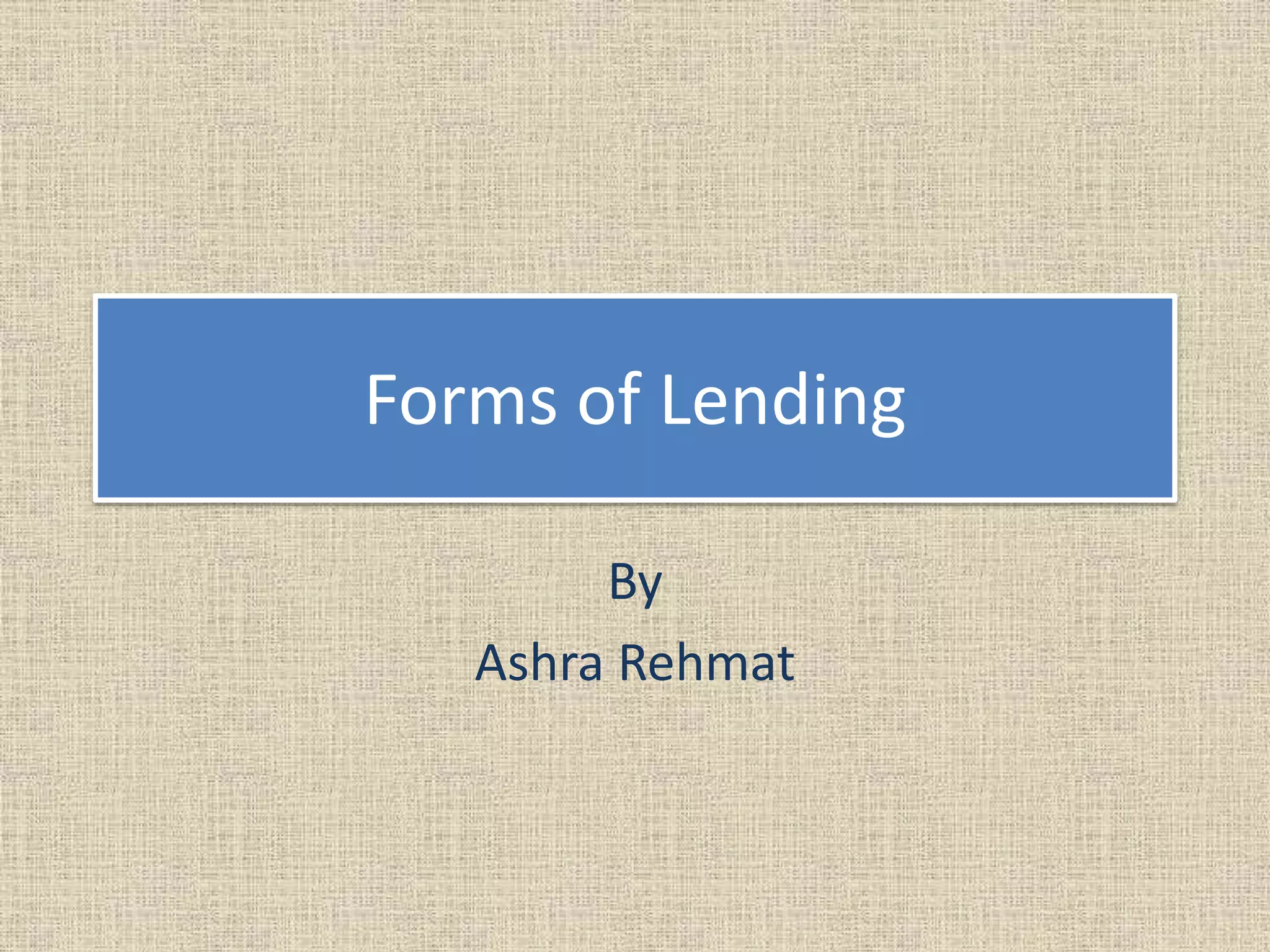 The document discusses various forms of lending provided by banks. It describes cash finance/cash credit, overdrafts, loans, purchase and discounting of bills, and hire-purchase/leasing finance. Cash finance allows borrowing up to a limit as needed, while overdrafts provide temporary adjustments. Loans involve lump sums paid for a period at interest. Purchase and discounting of bills advances money by deducting discount from bill values. Hire-purchase/leasing finance allows purchasing goods through installments. The principles of lending like safety, liquidity, security and diversification of risk are also outlined.