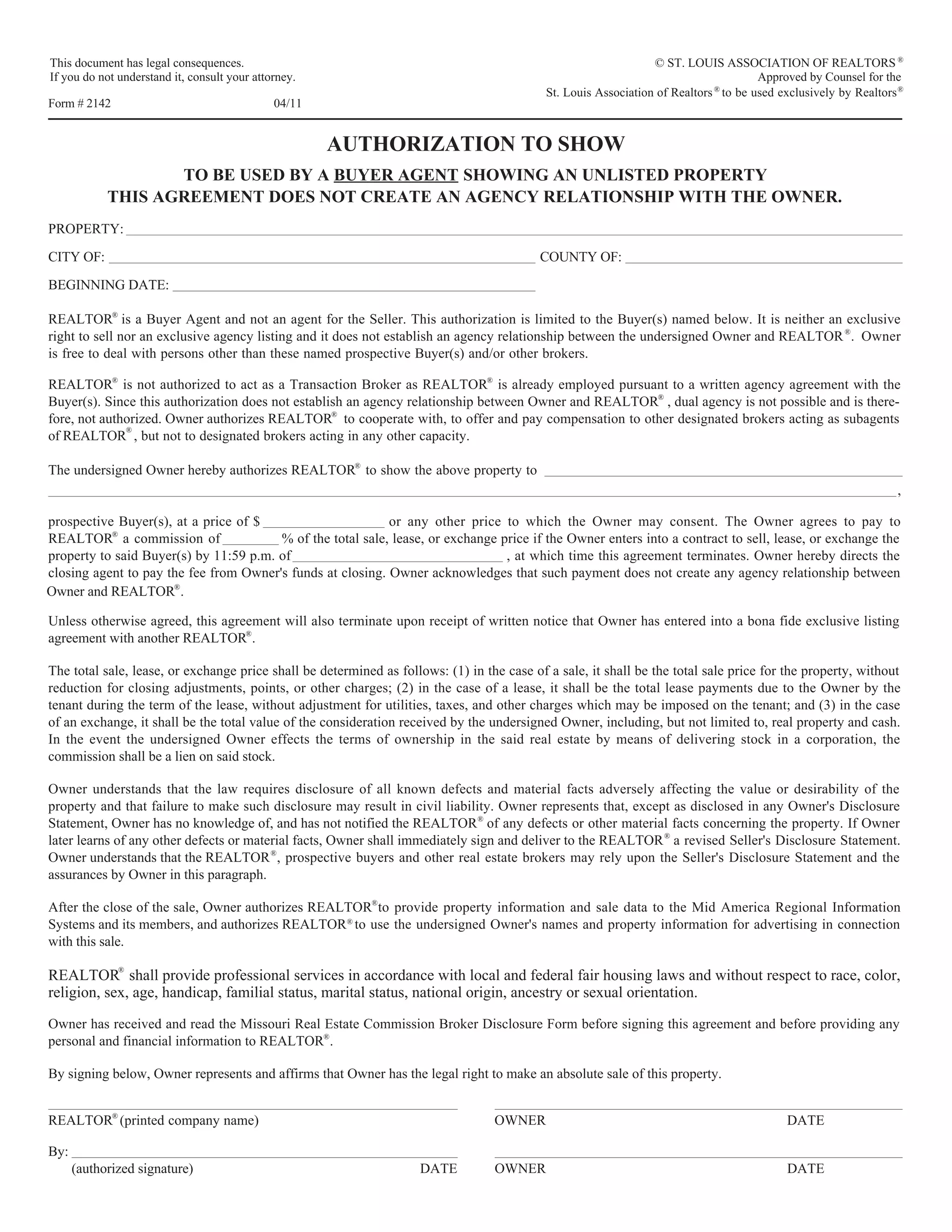 This document authorizes a realtor to show an unlisted property to prospective buyers. It does not create an agency relationship between the realtor and property owner. The owner agrees to pay the realtor a commission if the owner enters into a contract to sell the property to the prospective buyers by a specified date. The document outlines the realtor's duties to the buyers, such as presenting all offers and disclosing defects, as well as limitations on agency relationships.