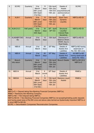 1. The document outlines 16 different types of returns that must be submitted by various categories of Non-Banking Financial Companies (NBFCs) to the Central Repository of Information on Large Credits (COSMOS) system on a quarterly, half-yearly, or annual basis.