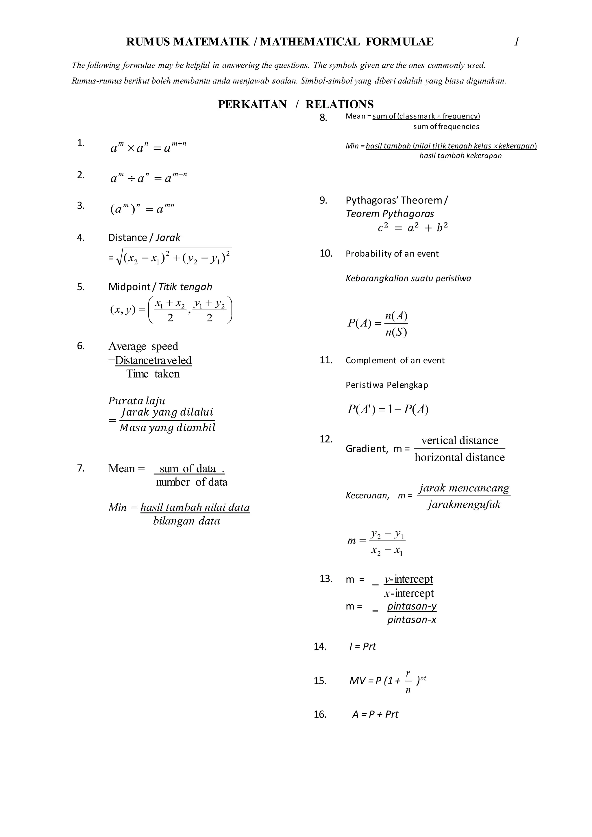 This document provides mathematical formulae in two sections. The first section covers relations, distance, average speed, mean, Pythagoras' theorem, probability, and other concepts. The second section covers shapes and space, including formulae for the area of rectangles, triangles, parallelograms, trapezoids, circles, cylinders, spheres, and other geometric objects. It also includes formulae for volume, circumference, scale factor, interior angles of polygons, and other spatial relationships. The symbols used in the formulae are explained. This document serves as a reference for standard mathematical formulae.