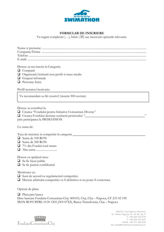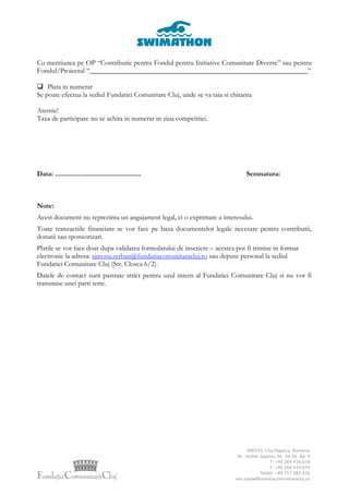 Acest document este un formular de înscriere pentru participarea la o competiție, solicitând informații personale precum nume, companie, telefon și e-mail. Participanții pot alege categoria de înscriere și suma dorită pentru contribuții, iar plățile se pot efectua fie prin transfer bancar, fie în numerar la sediul fundației. Documentul subliniază că înscrierea nu reprezintă un angajament legal și că informațiile vor fi folosite strict intern.