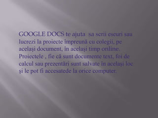 Google Docs permite colaborarea în timp real pe documente, foi de calcul și prezentări, accesibile de pe orice computer. Utilizatorii pot beneficia de diverse funcții, inclusiv procesor de text, editor de prezentări și module de calcul tabelar, toate fiind gratuite. Feedback-ul poate fi solicitat prin crearea unui formular și trimis via e-mail, asigurându-se că mesajul este clar și bine înțeles.