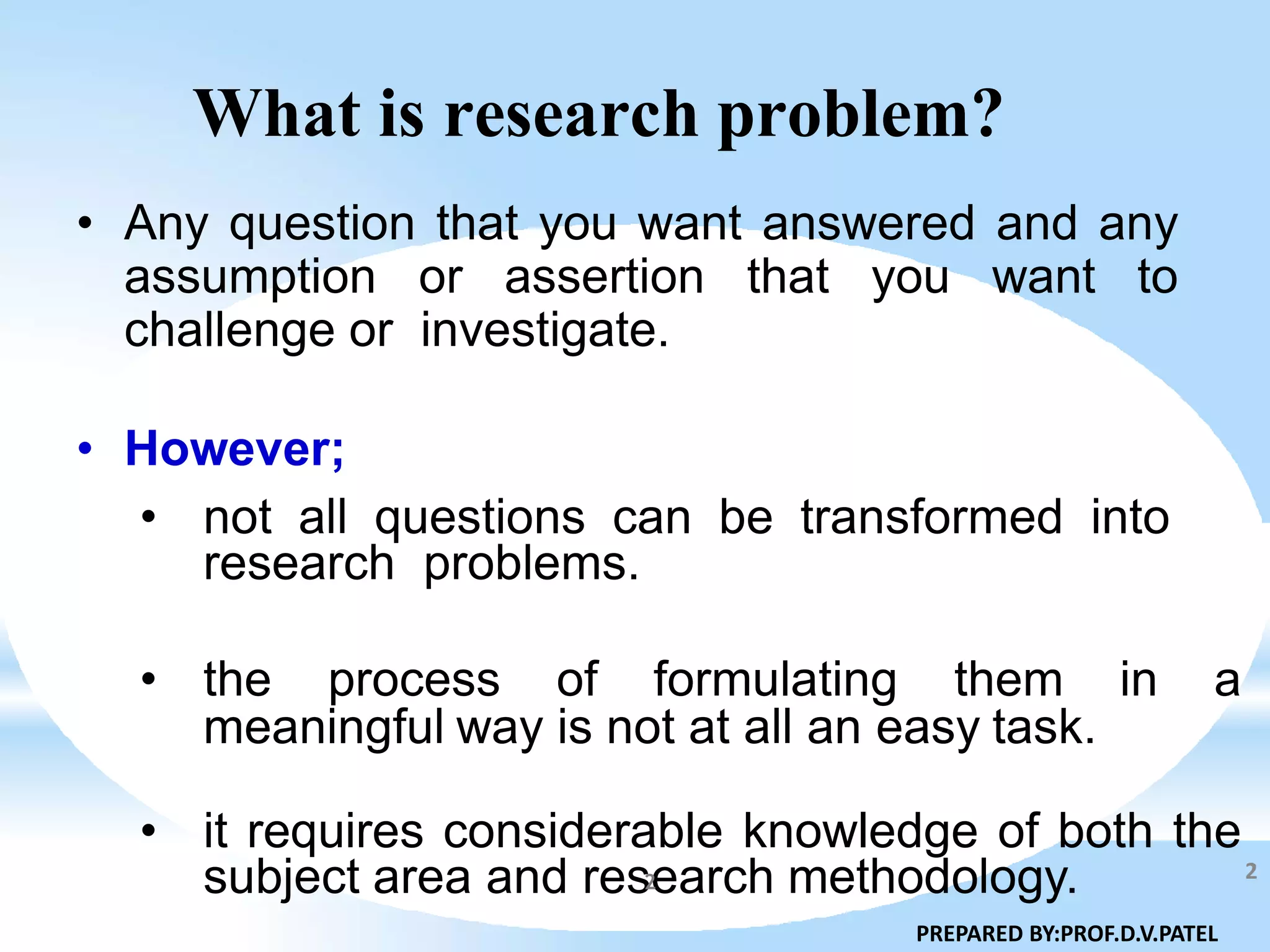 The document discusses what constitutes a research problem and how to formulate one. A research problem is defined as any question an researcher aims to answer or assumption they want to challenge. However, not all questions can be research problems - it takes considerable knowledge and effort to develop a meaningful research problem. The key steps to formulating a research problem are to identify a broad topic of interest, narrow it down to a specific sub-area, develop research questions within that area, and define clear objectives to address the research questions. Properly formulating the research problem is crucial as it determines all subsequent research design choices.