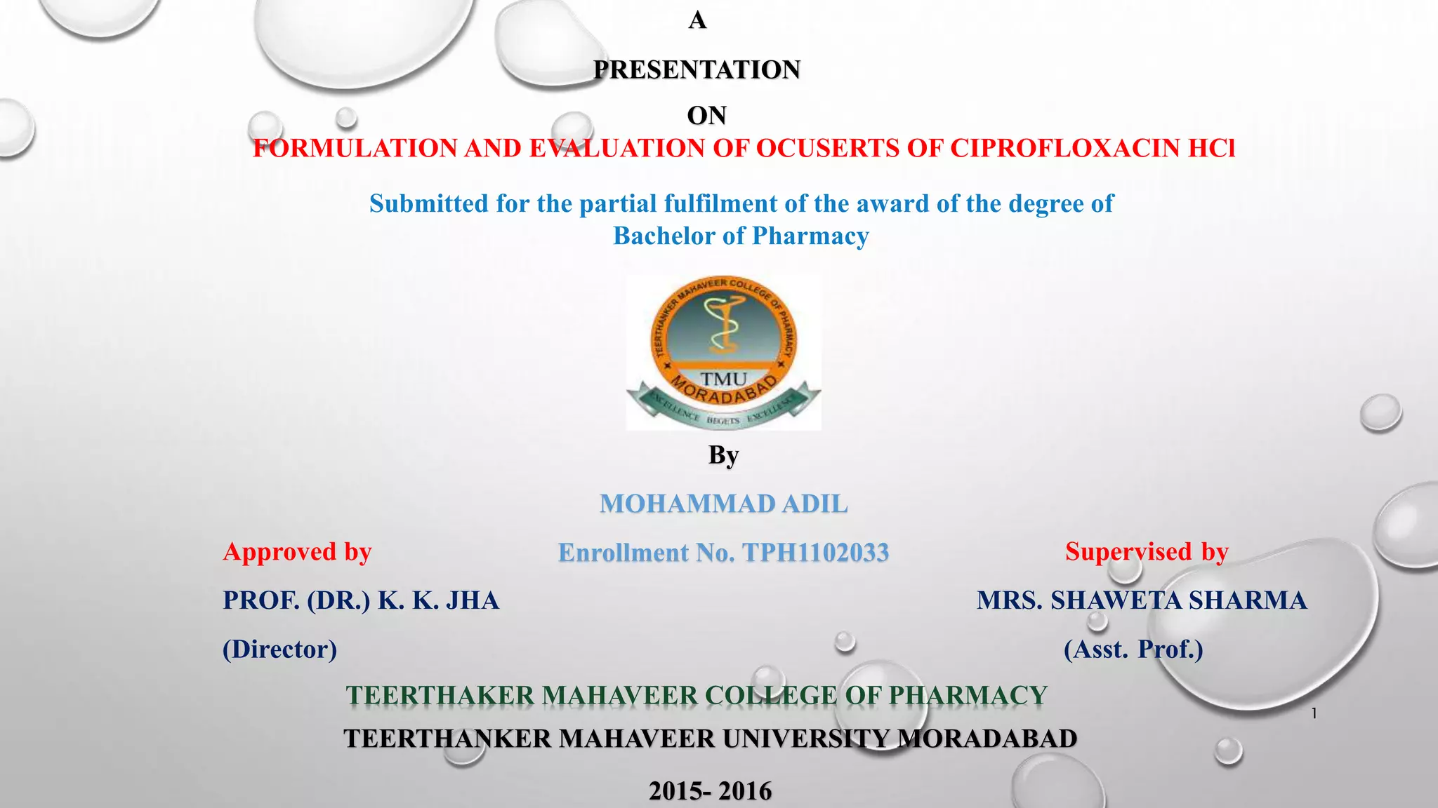 The document presents a study on the formulation and evaluation of ciprofloxacin HCl ocuserts, which are ocular inserts designed for sustained drug delivery. It describes the advantages of ocuserts over traditional ocular formulations, including prolonged drug release and improved patient compliance. The study includes methods of preparation, in vitro evaluation results, and concludes that the developed ocuserts could provide a better alternative for ocular drug delivery.
