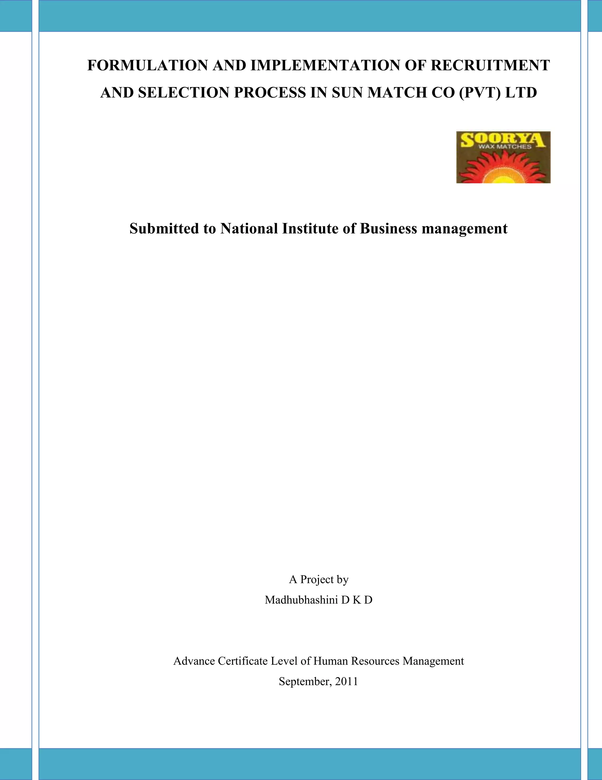 This document discusses the recruitment and selection process at Sun Match Co (Pvt) Ltd. It begins with an overview of key human resource management concepts like human resource planning and job analysis that are important for recruitment. It then examines the recruitment process in detail, including the purpose of recruitment, factors to consider, and common sources. The selection process is also explored, outlining techniques used. The document then provides an introduction to Sun Match Co and outlines their human resources policy for recruitment and selection. It concludes with suggestions and a conclusion on applying recruitment and selection concepts.