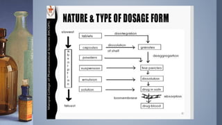 This document discusses factors that influence drug absorption from various pharmaceutical dosage forms. It outlines several formulation variables like excipients, manufacturing processes, dosage form characteristics, and drug properties that can impact the dissolution and absorption of drugs. These variables include excipient type and amount, particle size, polymorphism, compression force, method of granulation, viscosity, and surface area. The document also examines how these factors influence drug absorption from different dosage forms like tablets, capsules, solutions, emulsions, and powders. Understanding these variables is important for developing formulations that effectively deliver drugs to systemic circulation.