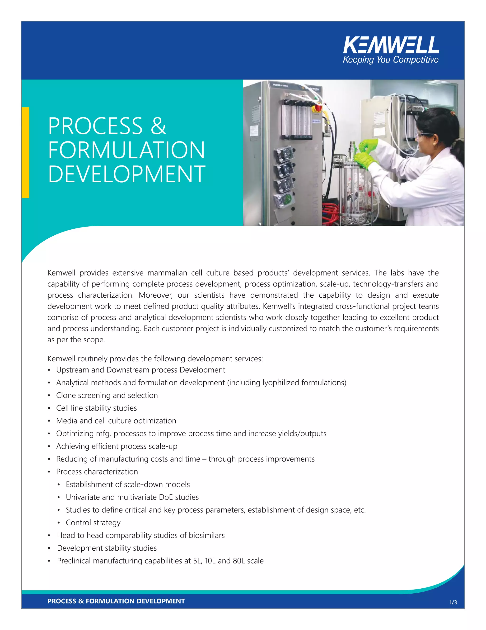 Kemwell provides comprehensive development services for mammalian cell culture products, including process optimization, technology transfers, and formulation development. The team employs a design-of-experiments approach for both upstream and downstream processes, prioritizing product quality and efficient manufacturing. Additionally, Kemwell conducts formulation development for clinical and commercial products, utilizing stability studies and collaborative efforts with analytical groups to optimize formulation profiles.