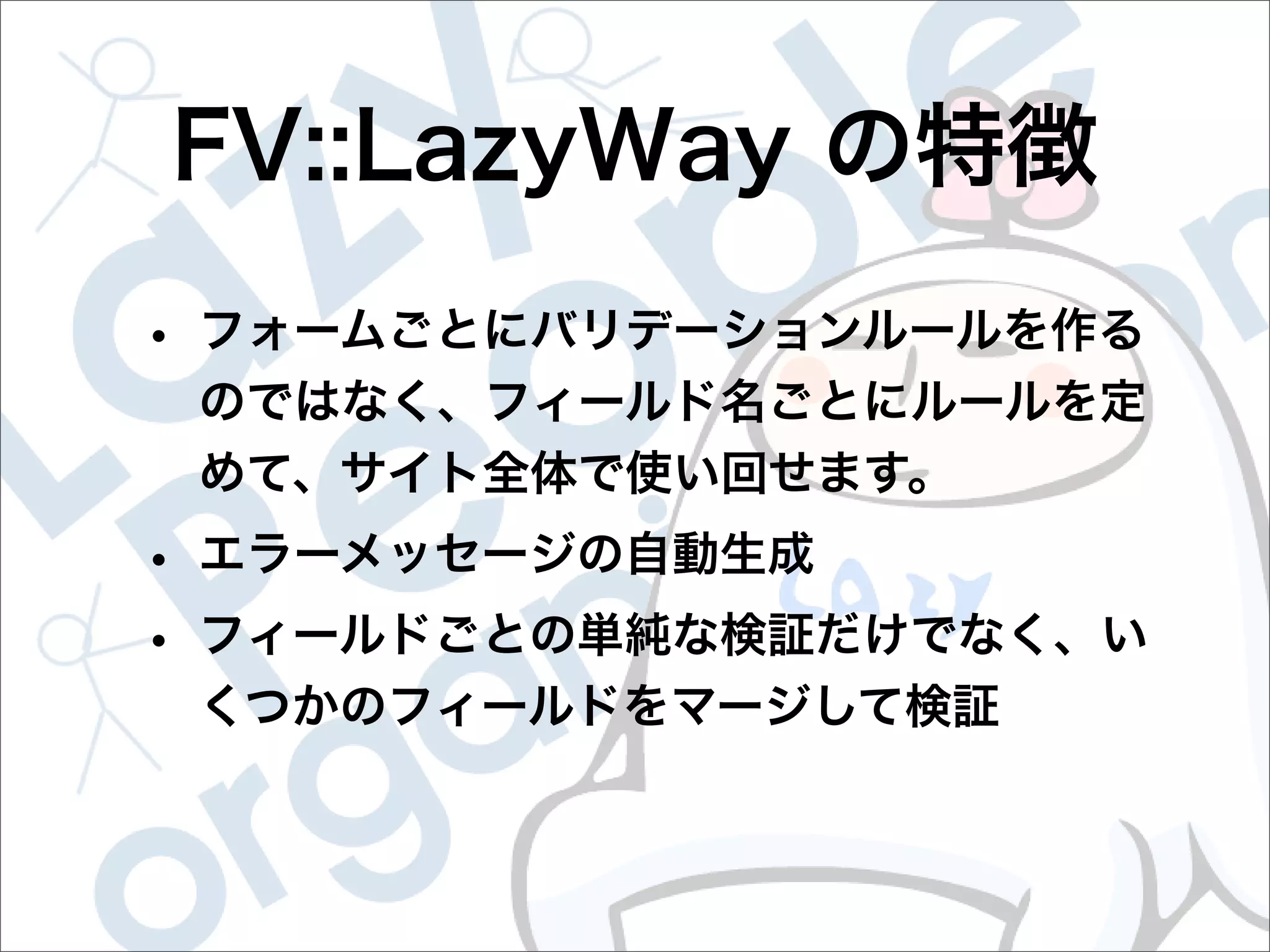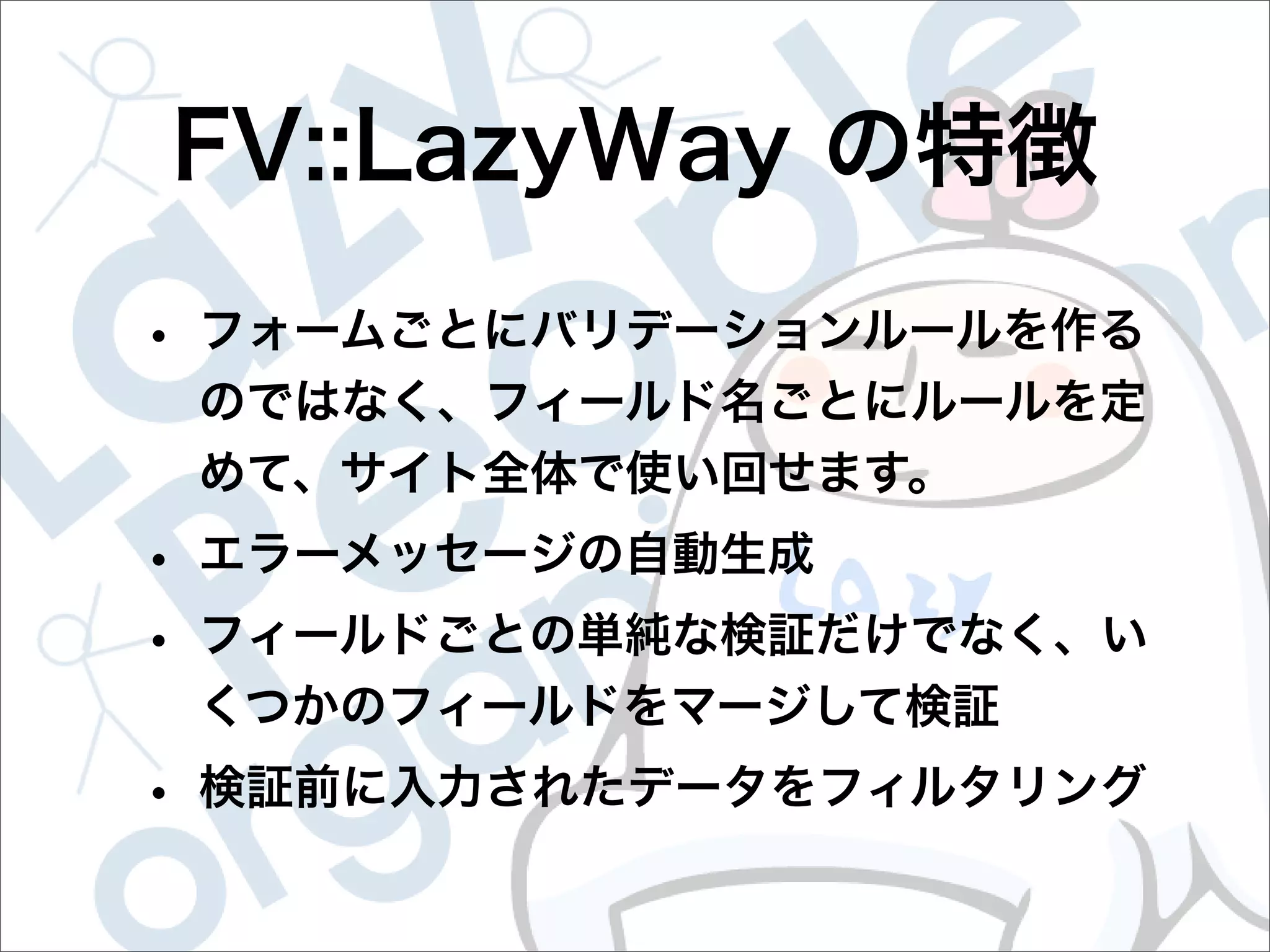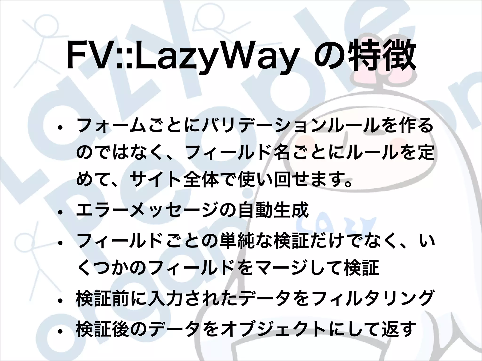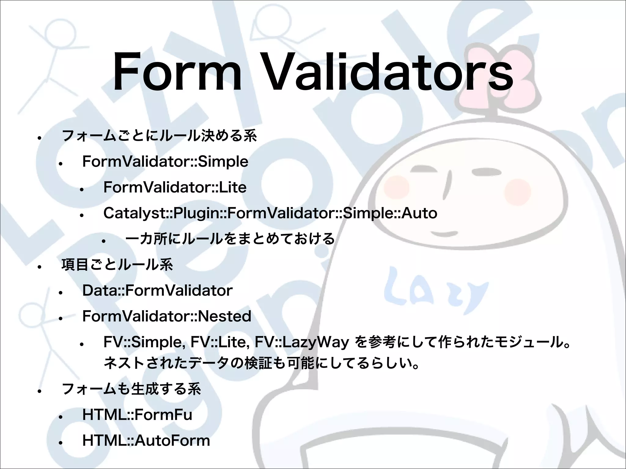 This document contains configuration details for form validation using the FormValidator::LazyWay module in Perl. The configuration includes validation rules for email and password fields, language and error message labels, and examples of running validation checks on query parameters and returning error results. Validation rules are defined for email format, password length and character set. Error messages can be customized and parameters can be passed directly to the validation check.