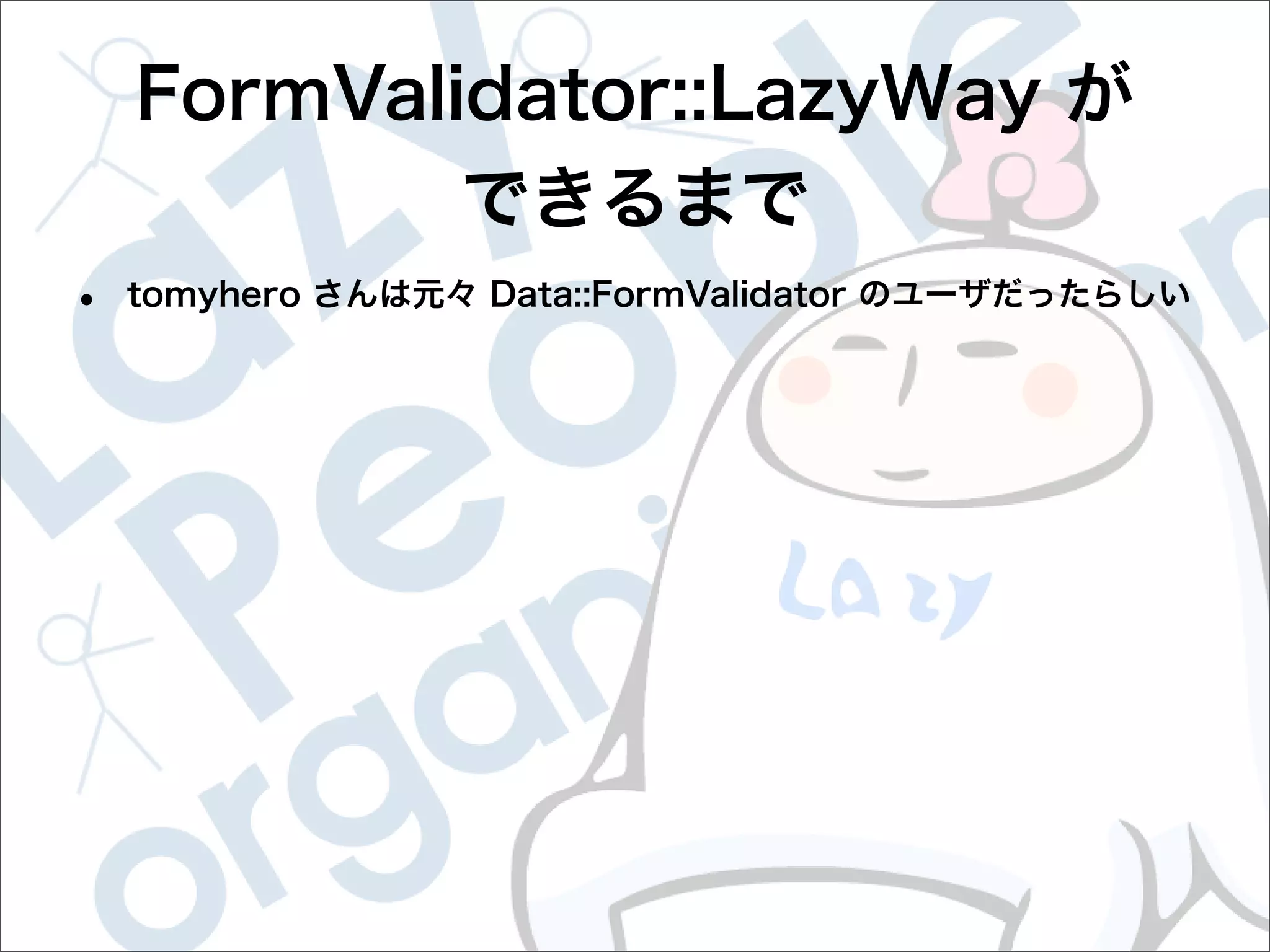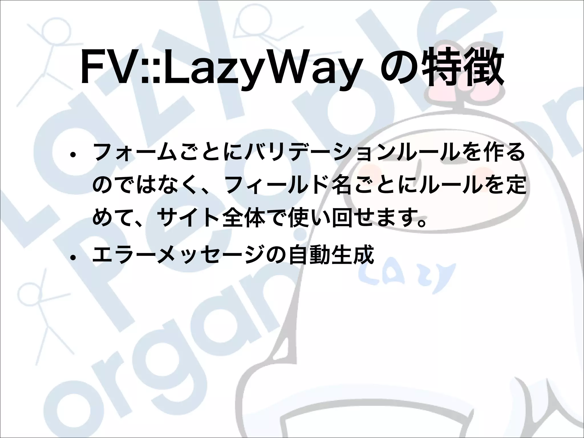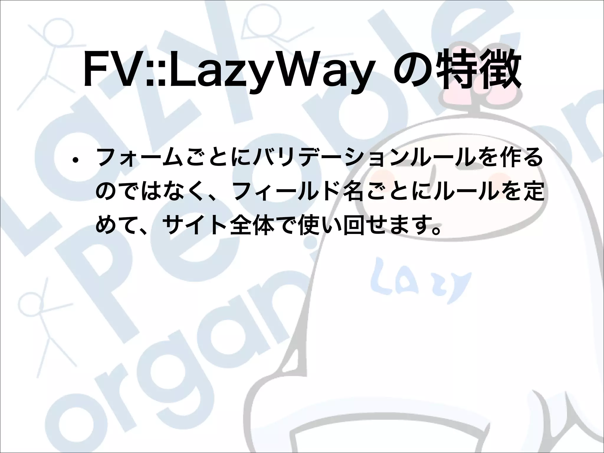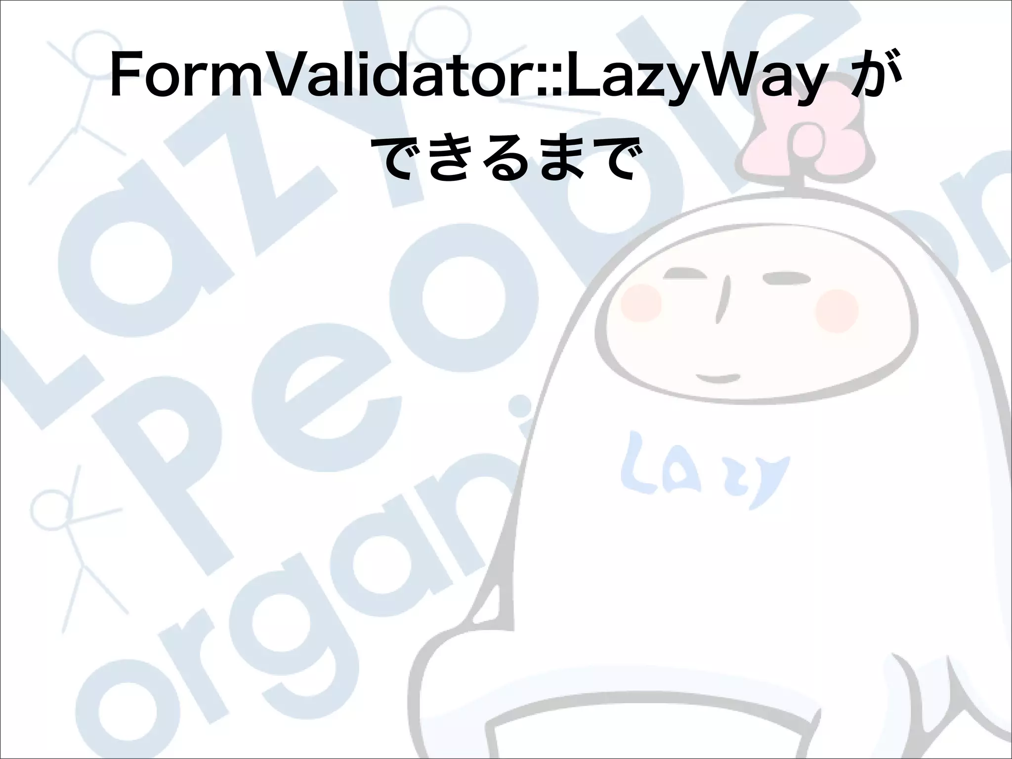This document contains configuration details for form validation using the FormValidator::LazyWay module in Perl. The configuration includes validation rules for email and password fields, language and error message labels, and examples of running validation checks on query parameters and returning error results. Validation rules are defined for email format, password length and character set. Error messages can be customized and parameters can be passed directly to the validation check.
