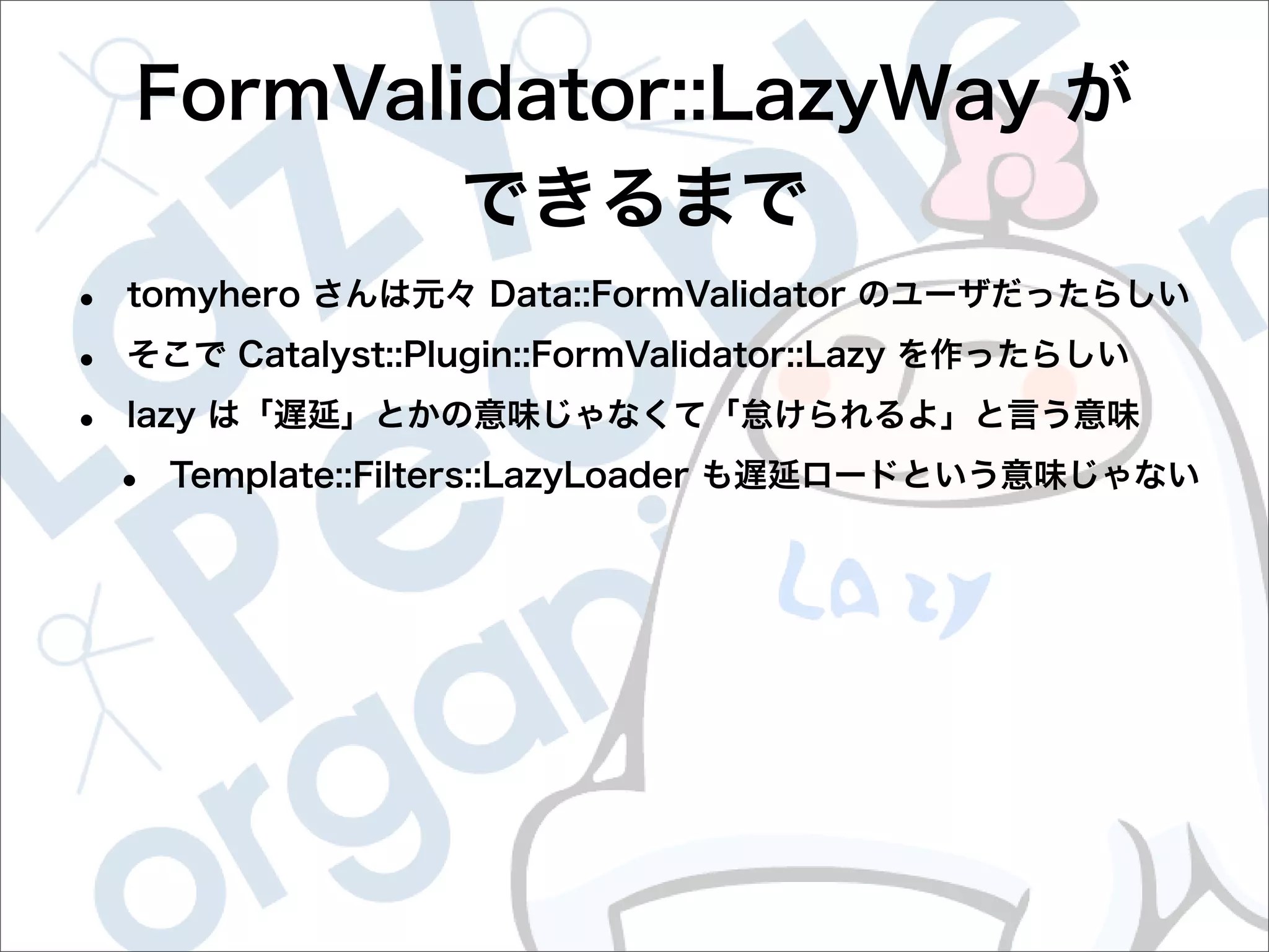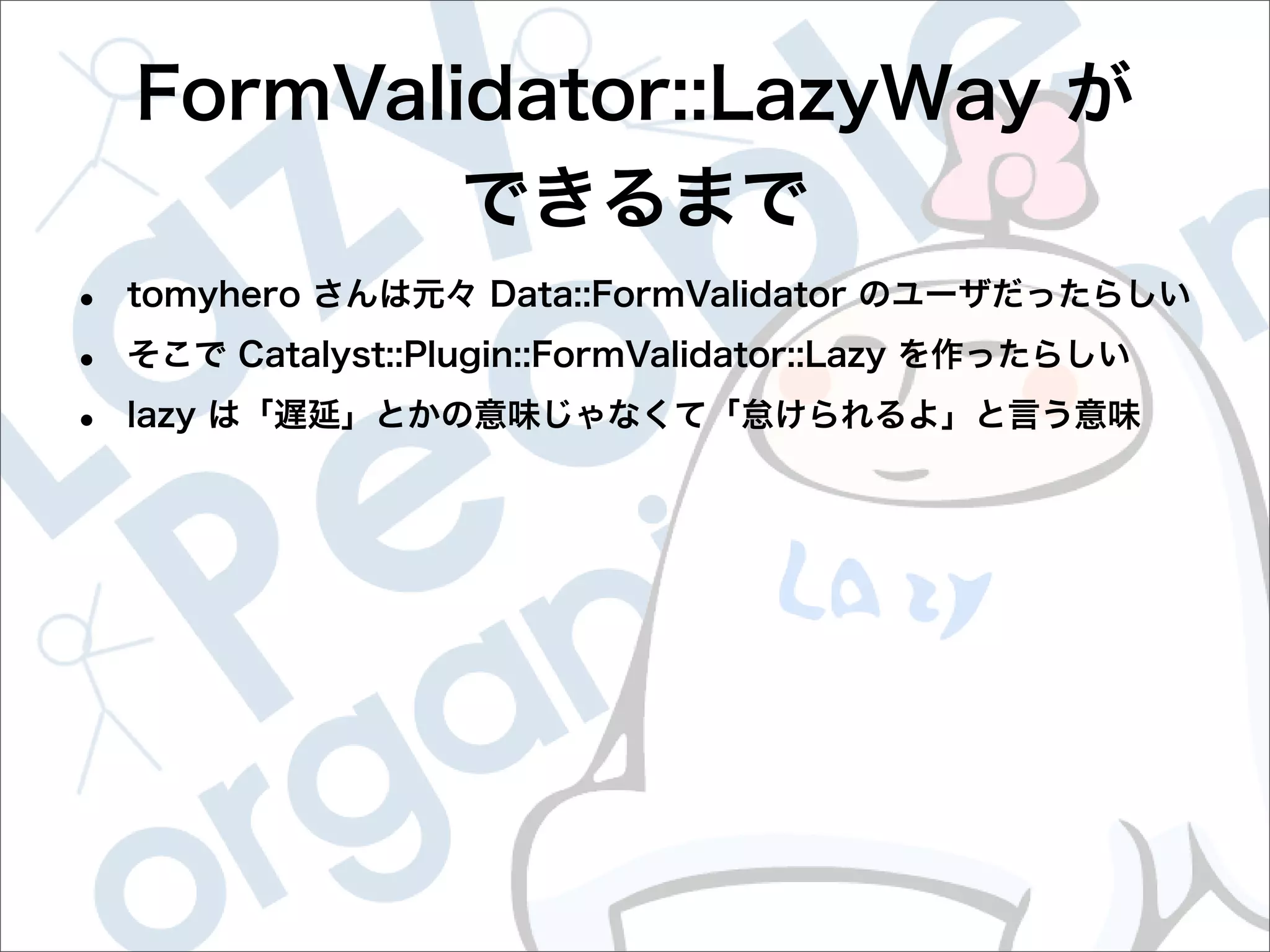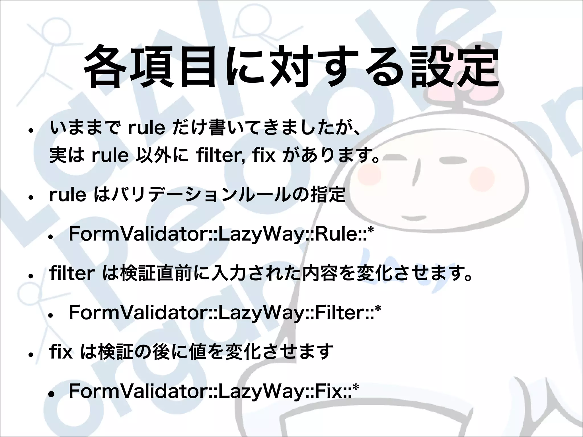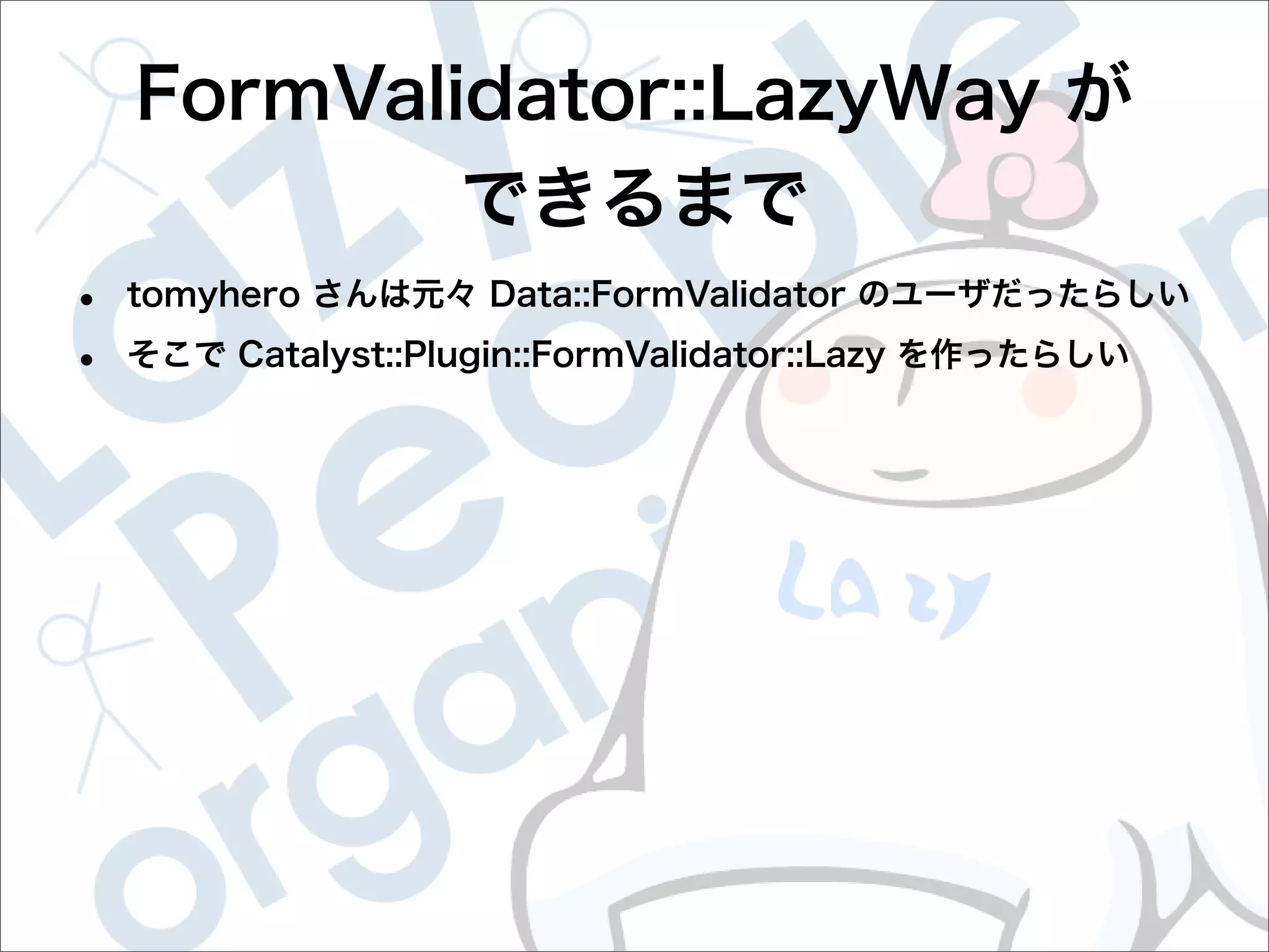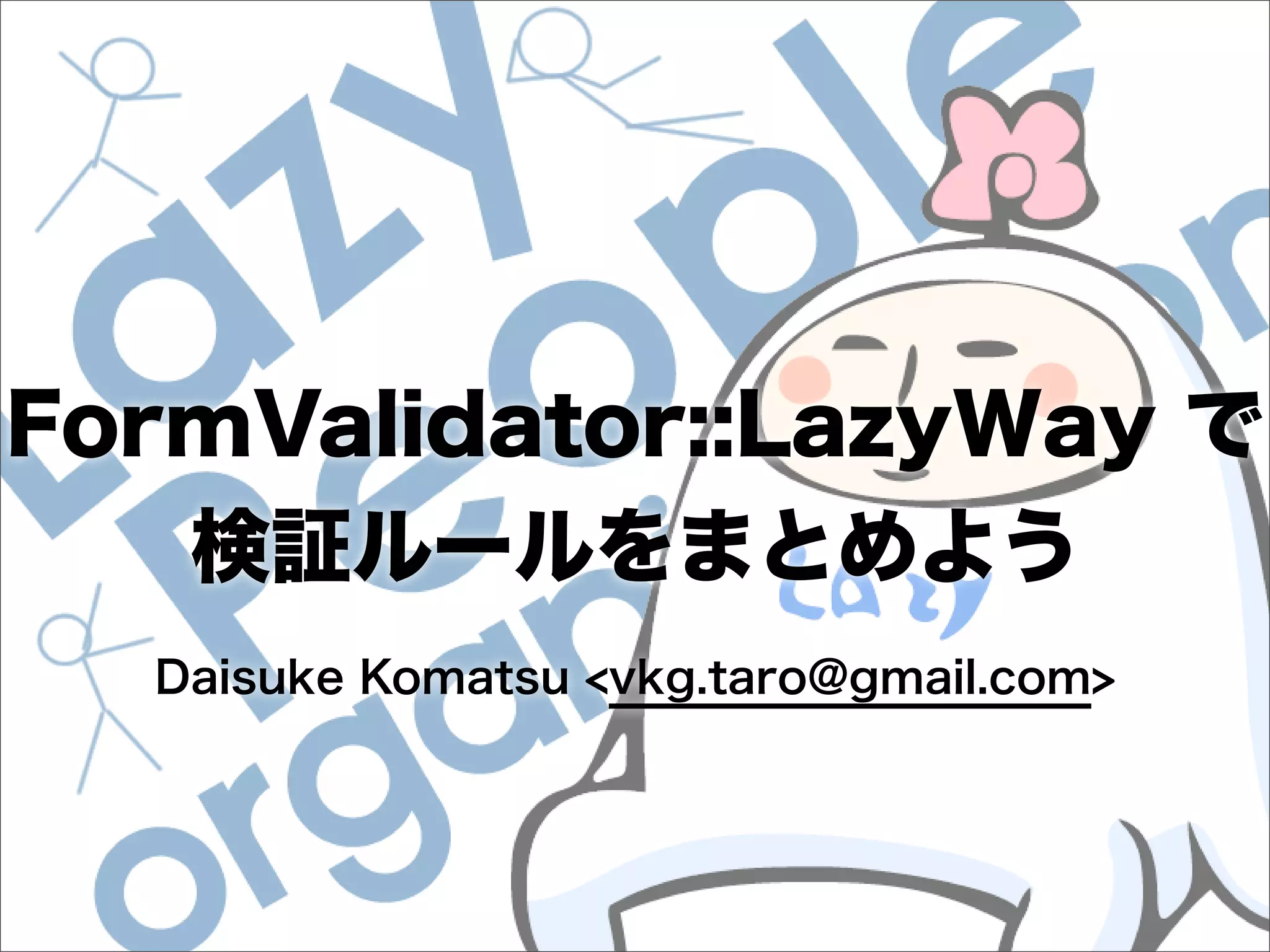 This document contains configuration details for form validation using the FormValidator::LazyWay module in Perl. The configuration includes validation rules for email and password fields, language and error message labels, and examples of running validation checks on query parameters and returning error results. Validation rules are defined for email format, password length and character set. Error messages can be customized and parameters can be passed directly to the validation check.