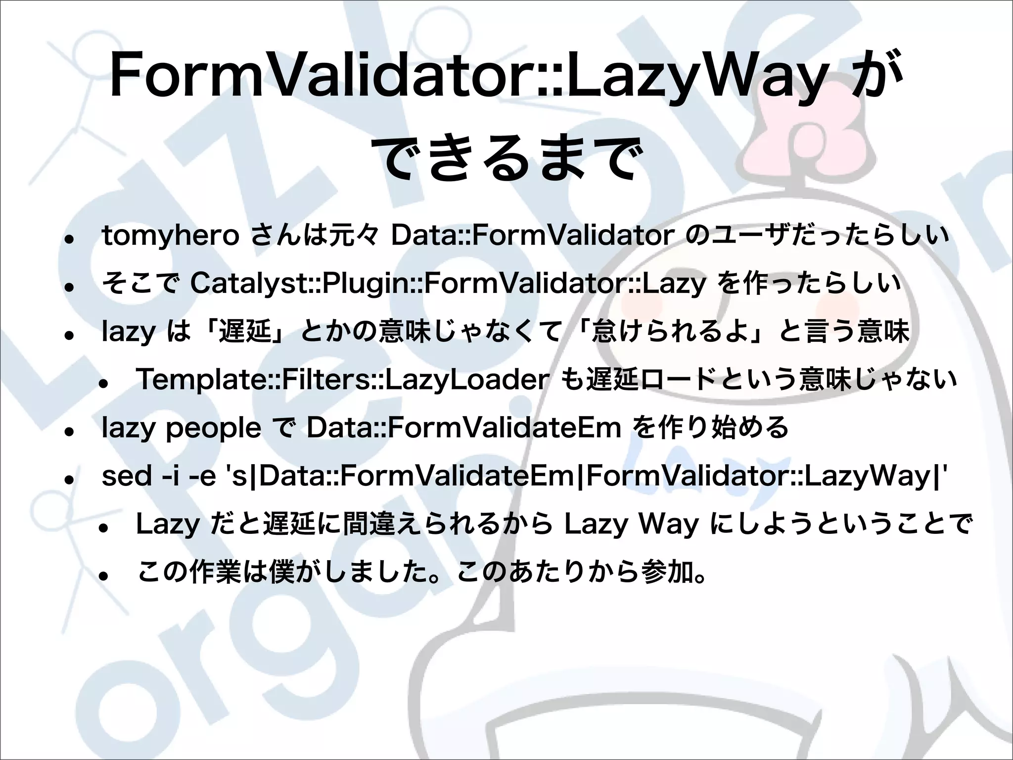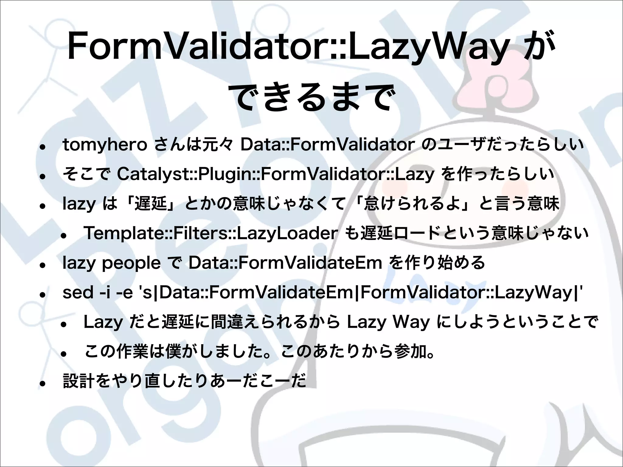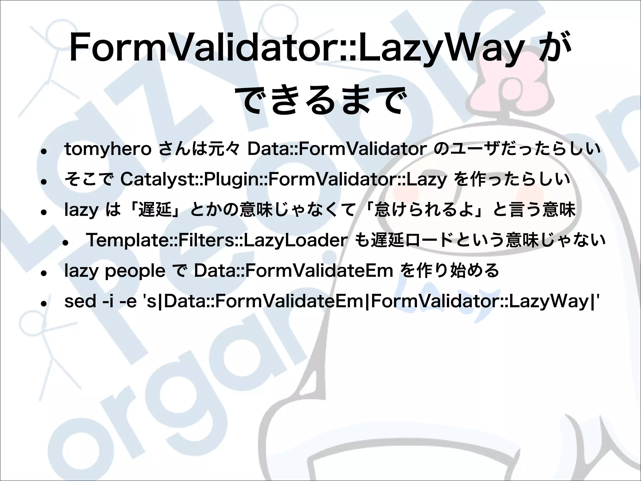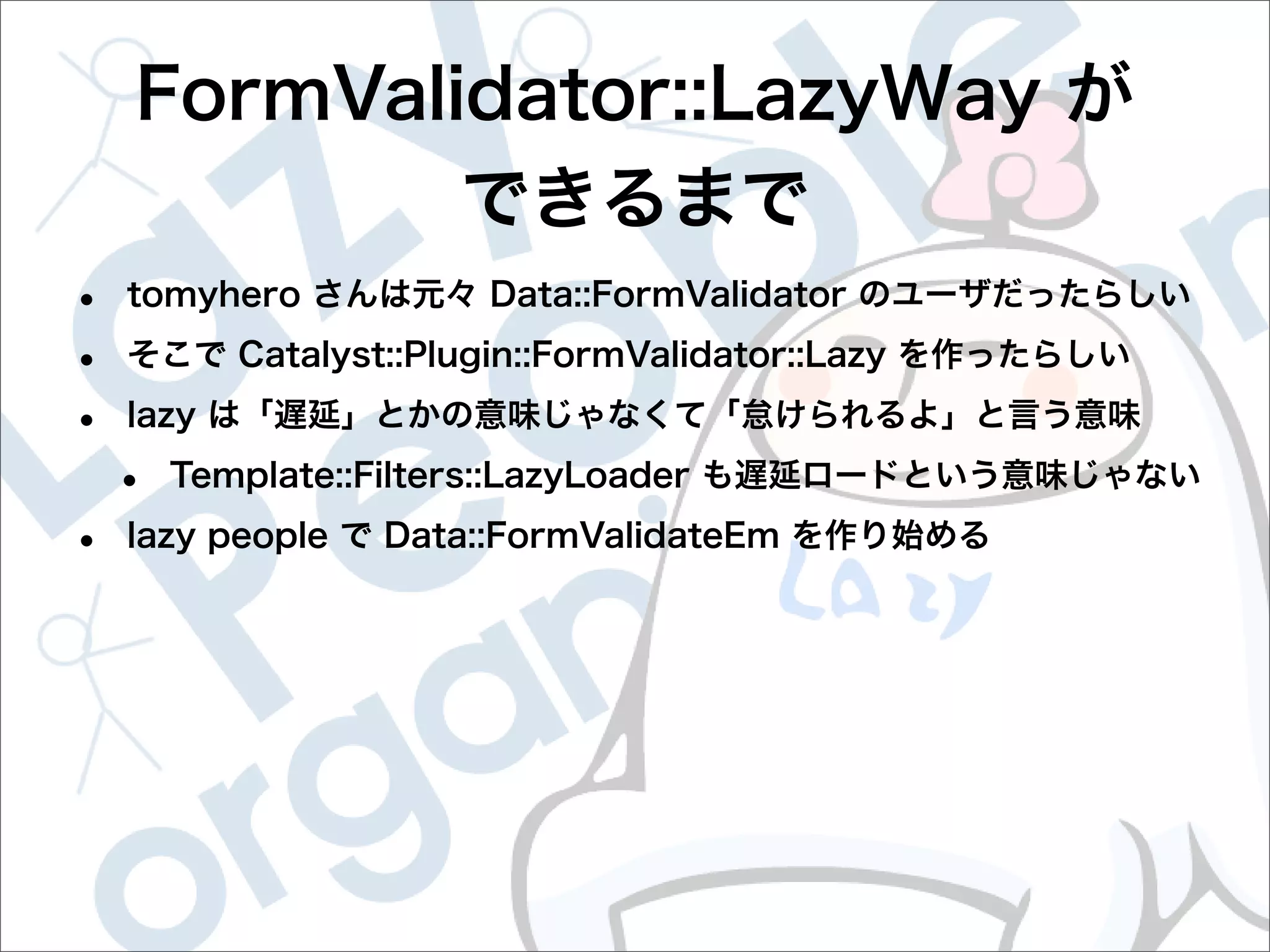 This document contains configuration details for form validation using the FormValidator::LazyWay module in Perl. The configuration includes validation rules for email and password fields, language and error message labels, and examples of running validation checks on query parameters and returning error results. Validation rules are defined for email format, password length and character set. Error messages can be customized and parameters can be passed directly to the validation check.