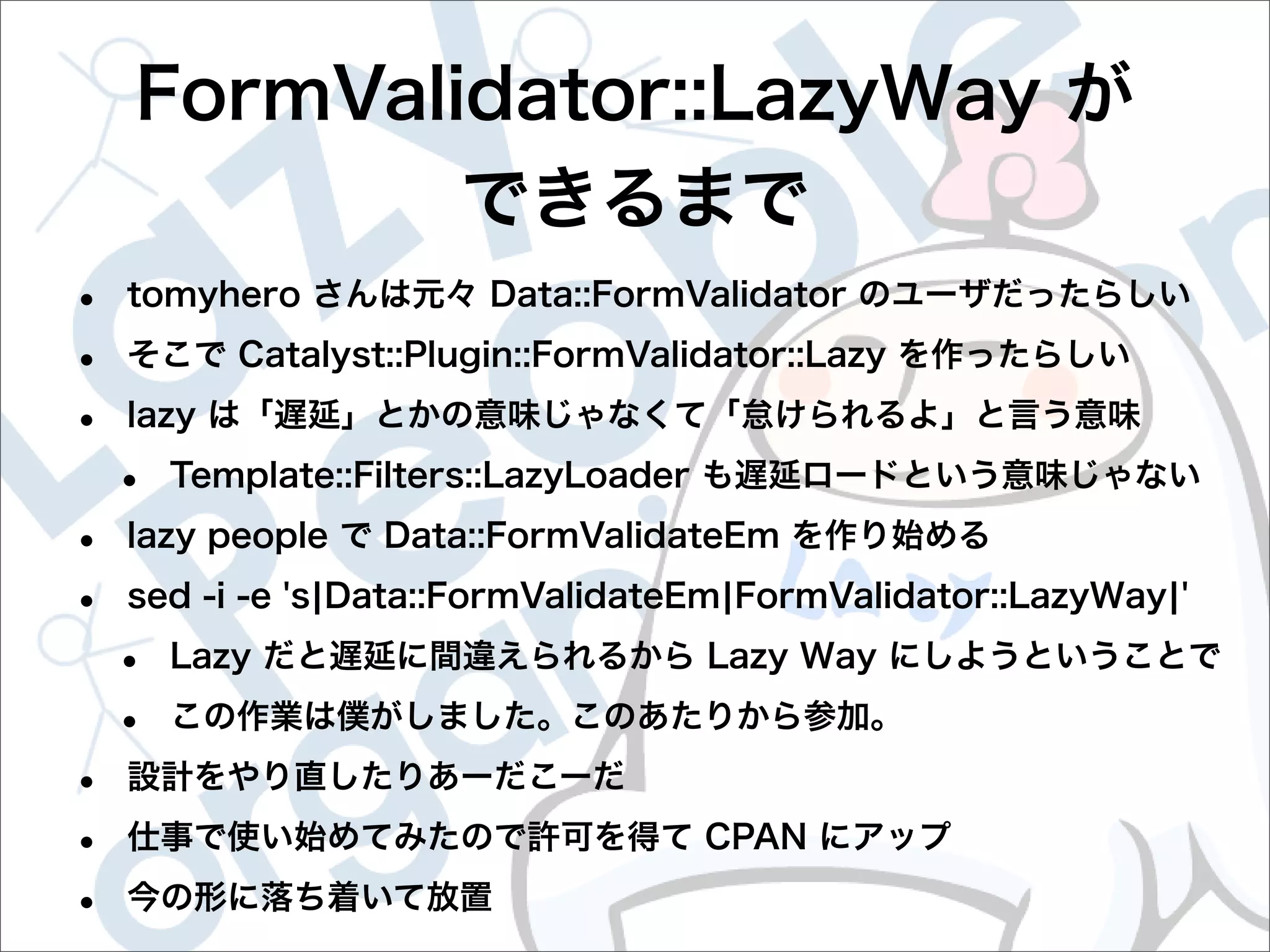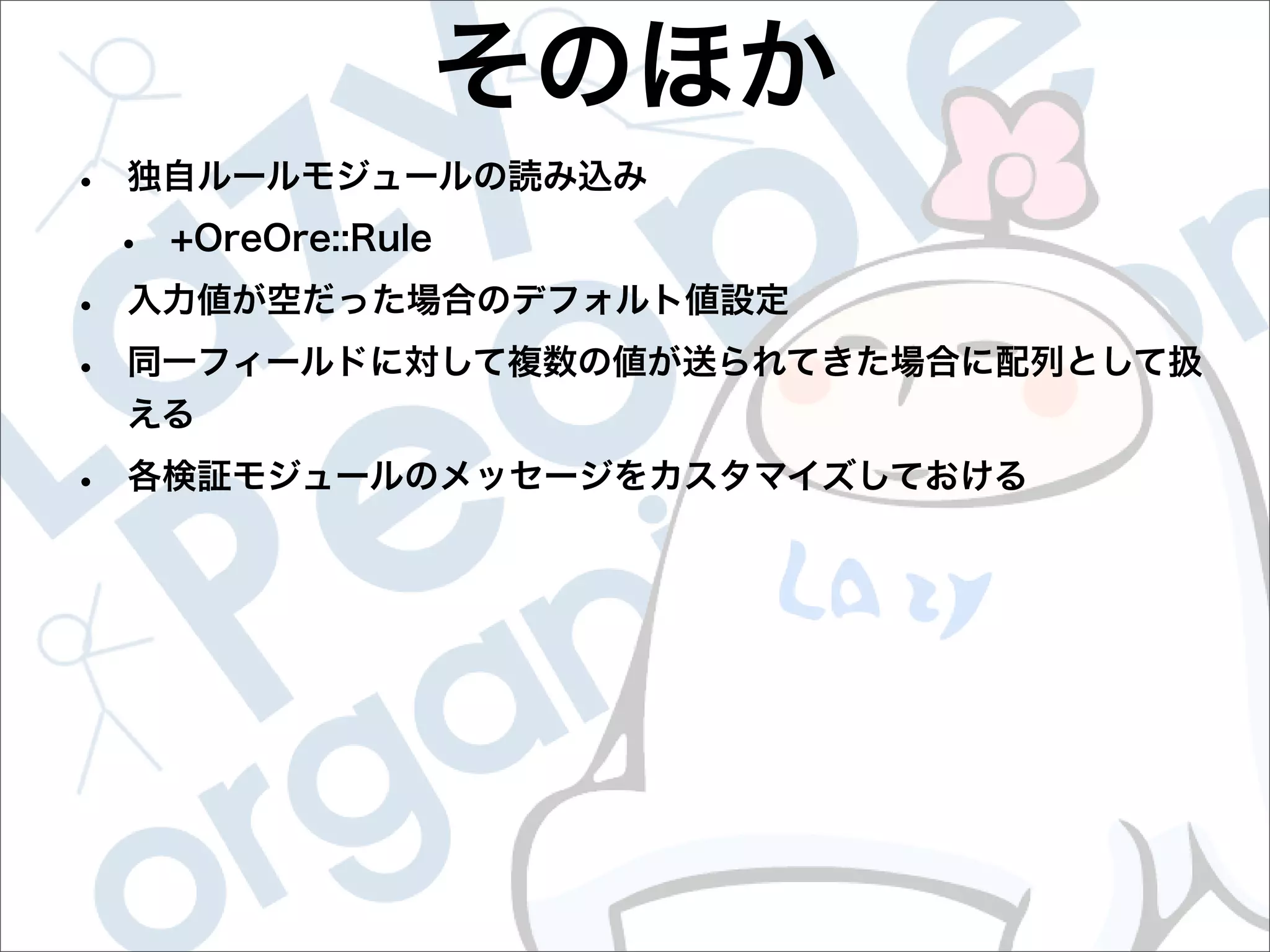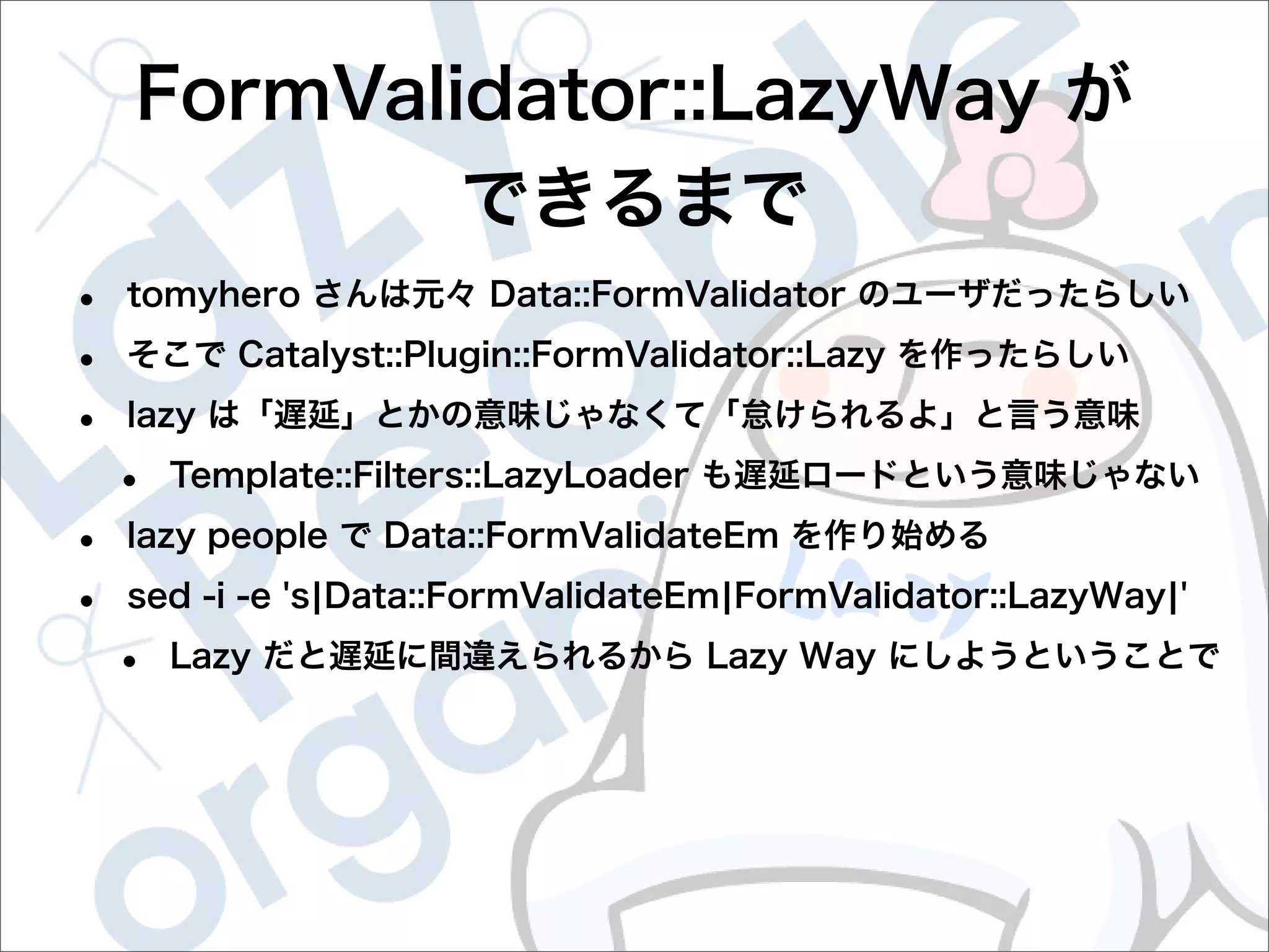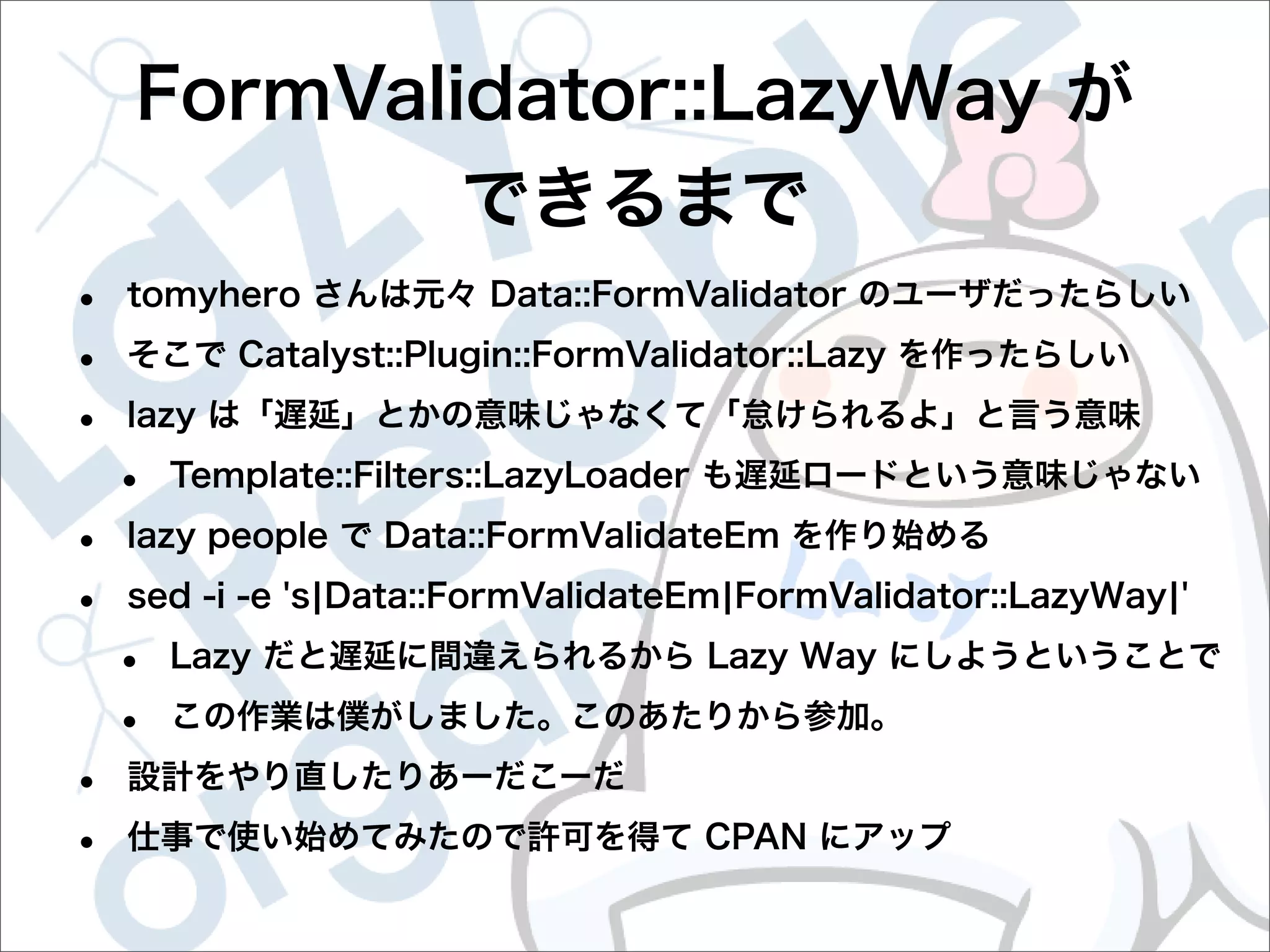 This document contains configuration details for form validation using the FormValidator::LazyWay module in Perl. The configuration includes validation rules for email and password fields, language and error message labels, and examples of running validation checks on query parameters and returning error results. Validation rules are defined for email format, password length and character set. Error messages can be customized and parameters can be passed directly to the validation check.