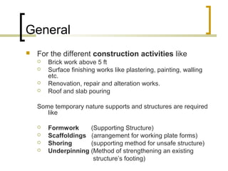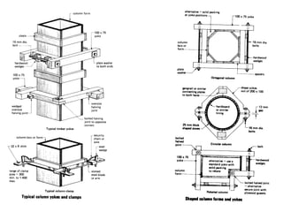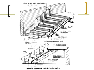 Formwork refers to the temporary structure used to support wet concrete until it is cured. There are different types of formwork including wood and steel. Wood formwork uses props, planks, battens and sheeting while steel uses sheets, angles and tees. Formwork must be strong, waterproof, and allow concrete to harden to the required strength before removal. The timing of removal depends on concrete mix design and weather conditions. Formwork is an important part of concrete construction and accounts for 20-40% of the total concrete cost.