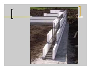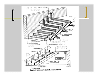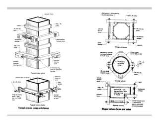This document provides information on formwork, scaffolding, and shoring used for construction projects. It defines each term and discusses the types, materials, and uses. For formwork, it describes the qualities, types including steel and wood, and details for foundations, walls, columns, slabs, beams, and stairs. It also addresses removal times, maintenance, costs, and advantages of steel formwork. For scaffolding, it outlines types such as single, double, ladder, cantilever, suspended, and steel/tubular along with their components. Finally, it defines shoring and describes methods for horizontal, vertical, and inclined shoring as well as underpinning techniques.