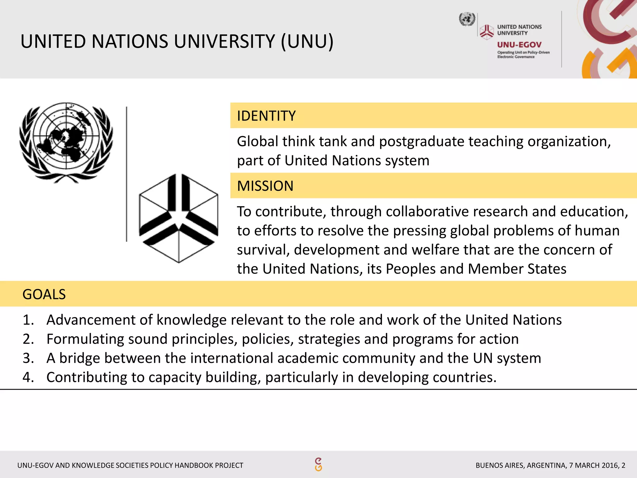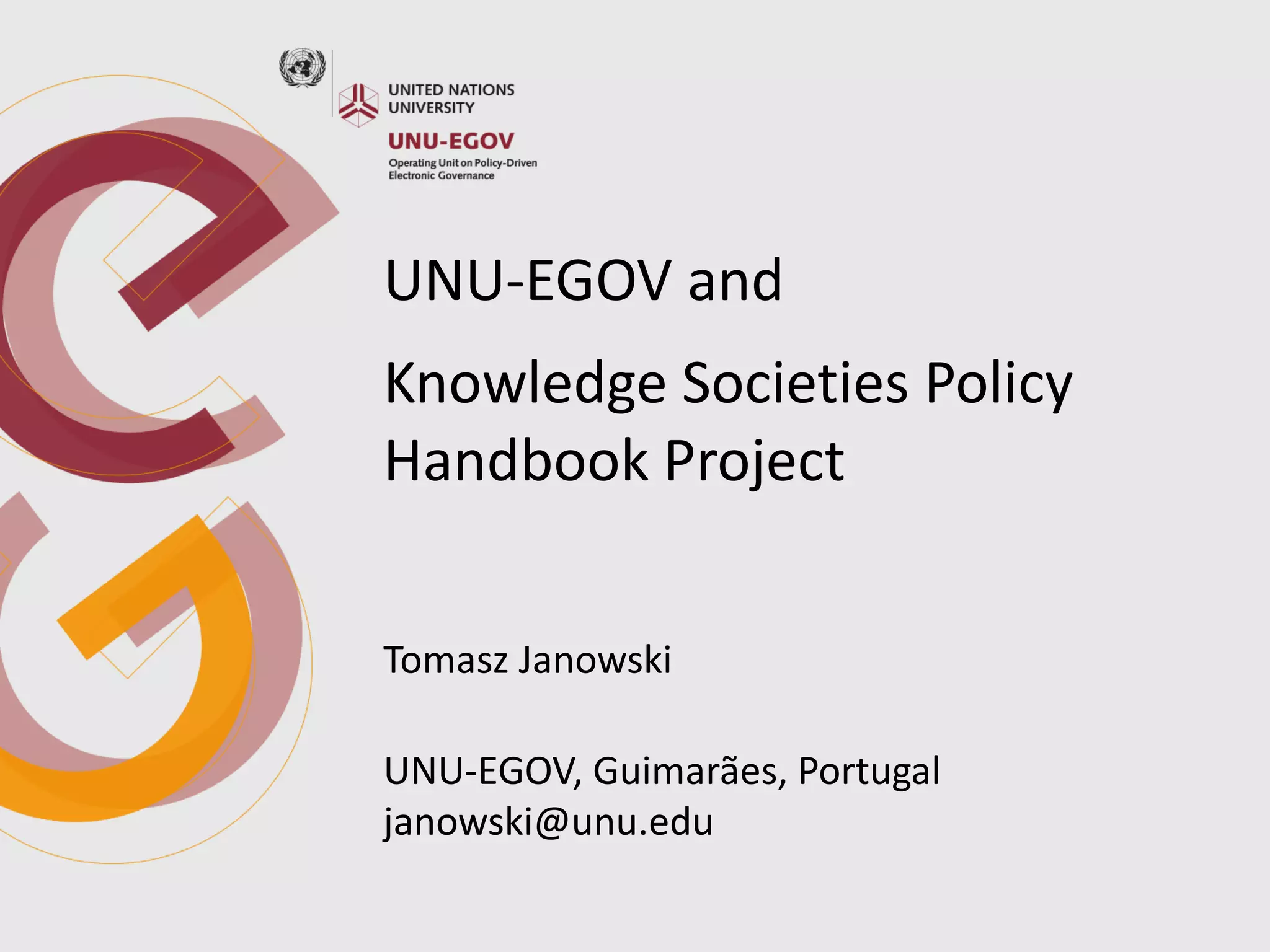 The document outlines the UNU-EGov and Knowledge Societies Policy Handbook Project, which aims to enhance governance capabilities through digital technology. It emphasizes the role of the United Nations University in fostering knowledge societies and supporting member states with policy-driven electronic governance. The project focuses on updating knowledge society policies and developing a global community for knowledge sharing and collaboration.