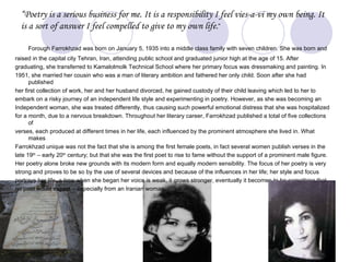 This document provides context about the Iranian poet Forough Farrokhzad and analyzes some of her poems. It discusses her upbringing and early life experiences that influenced her poetry. Two of her poems, "The Captive" and "To My Sister," are analyzed in detail, examining themes of freedom and oppression of women in Iranian society at that time. A third poem "The Sin" is also discussed, which boldly addressed female sexuality and intimacy in a way that was controversial. Farrokhzad's poetry broke barriers as one of the first prominent female poets in Iran to bring such themes to the forefront.