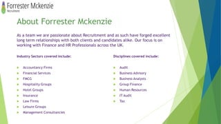 Forrester Mckenzie is a recruitment agency that specializes in placing finance and HR professionals in industries such as accounting, financial services, FMCG, hospitality, insurance, law firms, leisure, management consultancies, and more. They focus on recruiting candidates for roles such as audit, business advisory, business analysts, group finance, human resources, IT audit, and tax. The agency prides itself on building long-term relationships with both clients and candidates and taking a tailored approach to understanding requirements and finding the best fit.