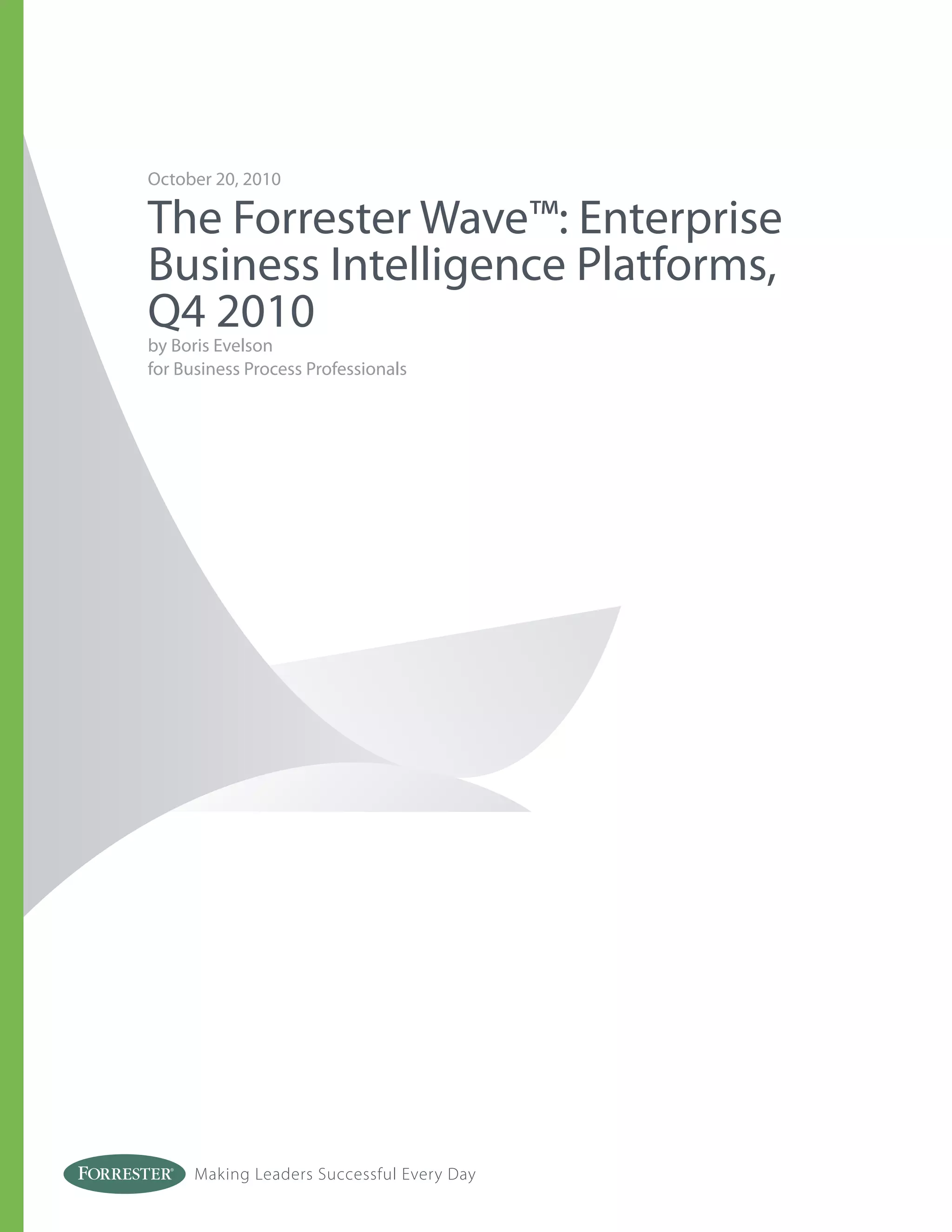 The document discusses the results of Forrester's evaluation of 11 enterprise business intelligence platform vendors based on 145 criteria. It found that IBM Cognos, SAP BusinessObjects, and Oracle led as Leaders due to the completeness of their BI and overall information management functionality. Actuate and TIBCO Spotfire were Strong Performers for offering comparable BI functionality but relying more on partners for other information management capabilities. QlikTech and Panorama Software moved into the Strong Performers category based on improvements in their analytical capabilities.