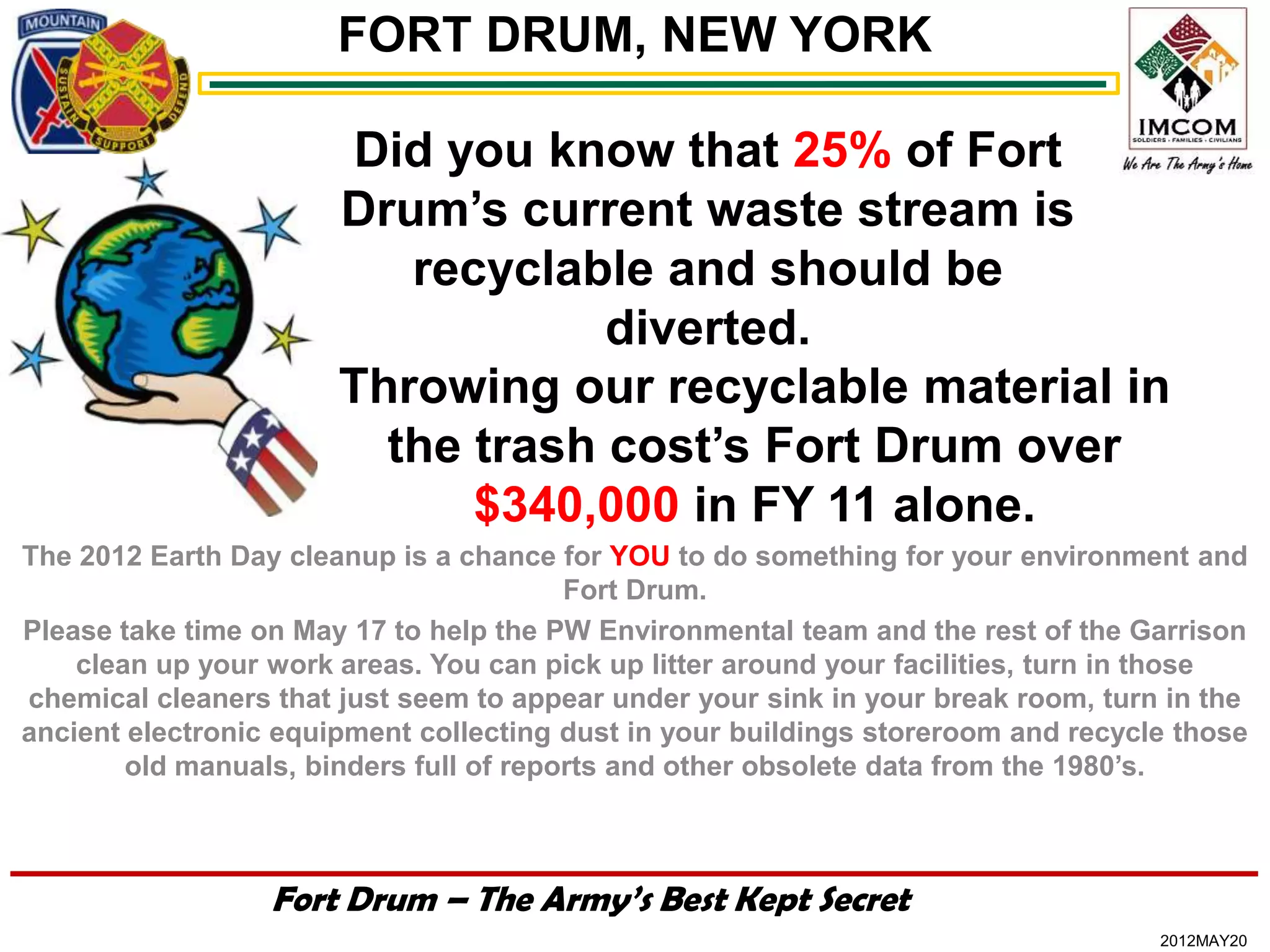 Fort Drum is holding an Earth Day cleanup event on May 17th to improve recycling and waste diversion. Currently only 29.7% of Fort Drum's waste is diverted from the landfill, costing over $340,000 annually. All personnel are encouraged to participate in cleaning their work areas and facilities, and properly disposing of litter, old equipment, and obsolete materials. Educational displays will promote recycling and hazardous waste disposal procedures.