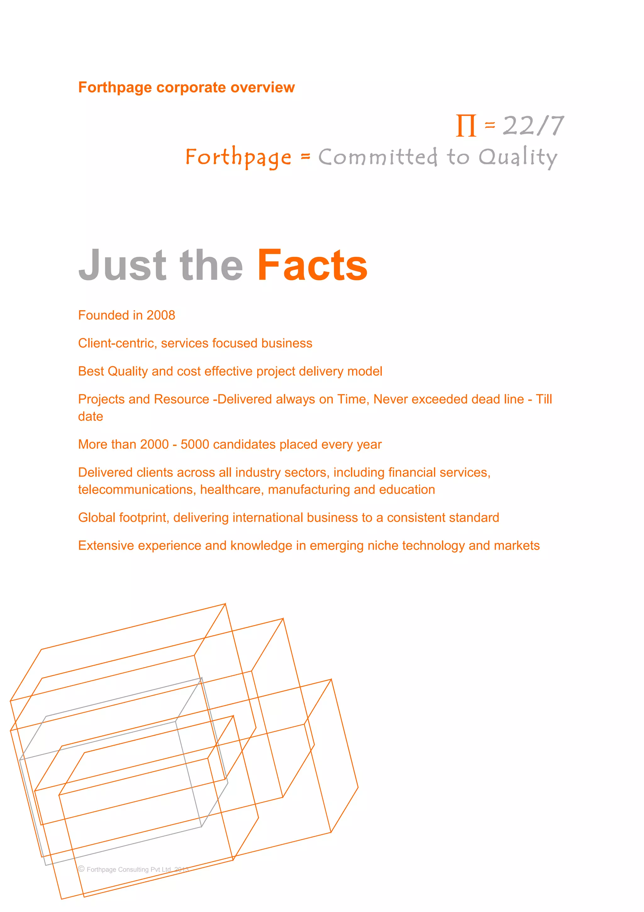 Forthpage is a consulting and staffing firm founded in 2008 that provides services including software consulting, IT outsourcing, training, executive search, and infrastructure services. It has a global footprint with clients in various industries. The company has placed over 2000-5000 candidates per year and delivers projects on time. It aims to help clients adapt to changing technology needs and provide customized solutions.