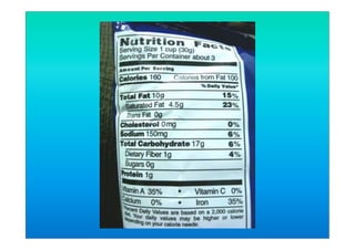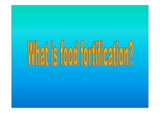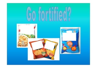 The document discusses fortified snack foods for kids. It provides background on malnutrition issues in the Philippines and food fortification programs and policies mandated by the National Nutrition Council and Republic Act 8976. Fortified foods can help address nutrient deficiencies, but snacks should be chosen carefully and consumed in moderation to avoid issues like obesity. A healthy diet emphasizes fruits, vegetables, and whole grains instead of heavily processed foods high in fat, sugar, and salt.