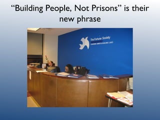 The document provides observations and suggestions for improving various areas of The Fortune Society, a nonprofit organization that works with formerly incarcerated individuals. It notes that the lobby and sign-in area could be more welcoming and informative for visitors. It also suggests that some educational and recreational activities, such as art programs and cooking classes, are popular with clients. However, it recommends making the common areas more inviting and adding sustainable food options. The document advocates for presenting information and rules in a friendlier manner to better assist clients.