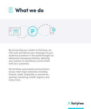 Fortytwo is a messaging solutions company that routes and delivers messages globally through their advanced messaging platform (AMP). They facilitate automated communication across many industries and are headquartered in Malta with a multicultural team. Fortytwo's main solutions include AMP for sending messages globally, number validation services to clean up databases, and machine-to-machine communication between devices.