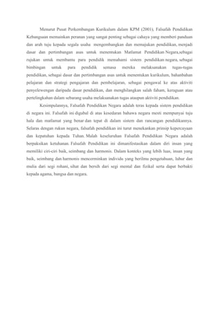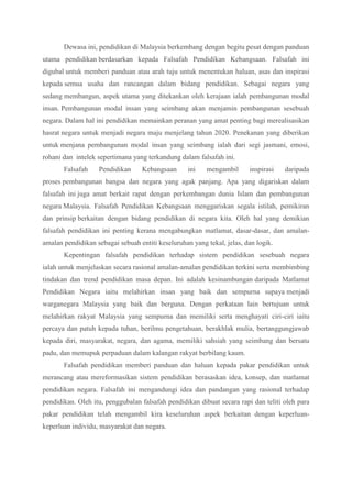 Falsafah Pendidikan Kebangsaan merupakan panduan utama untuk pembangunan sistem pendidikan Malaysia dengan menekankan pembentukan modal insan yang seimbang secara jasmani, emosi, rohani dan intelek untuk memastikan pembangunan negara menjadi maju pada tahun 2020. Falsafah ini memberi arah aliran kepada pendidik untuk merancang sistem pendidikan berdasarkan matlamat negara dalam melahirkan warganegara yang baik,