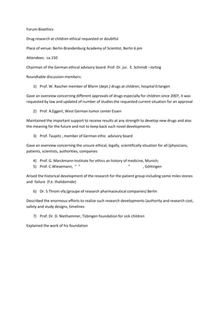 The Berlin-Brandenburg Academy of Scientists hosted a roundtable discussion on the ethics of drug research involving children. Approximately 150 attendees heard from seven speakers, including professors from universities across Germany and representatives from regulatory and pharmaceutical organizations. The speakers addressed the legal and ethical challenges of drug research in children, discussed the historical developments and failures that have shaped regulations, and emphasized the importance of continued research to develop new treatments for pediatric patients.
