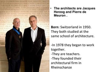 The document describes the favorite building of the author, the Forum Building in Barcelona, Spain. It was designed by Swiss architects Jacques Herzog and Pierre de Meuron in 1996. The triangular shaped building stands 180 meters on each side and 25 meters tall in the Forum neighborhood. The document also briefly mentions several other notable buildings designed by Herzog and de Meuron, including the Walker Art Center in Minneapolis, Philharmonic Hall in Hamburg, Beijing National Stadium, and Allianz Arena stadium in Munich.
