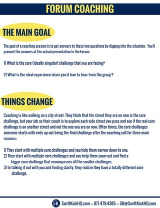 1) The document provides tips and guidance for coaching forum members to help them effectively present challenges and desired experiences at forum meetings.