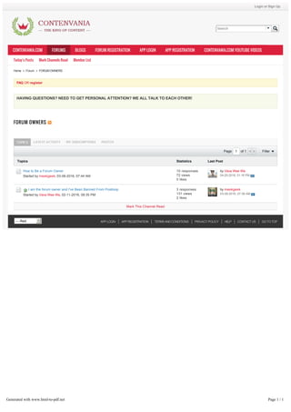 This document contains information about becoming a forum owner and discusses issues forum owners may face, such as being banned from their own forum. It provides instructions on how to register as a forum owner and set the terms and conditions and privacy policy for the forum. Contact information is also listed for users seeking personal attention or who have questions about the forum ownership process.