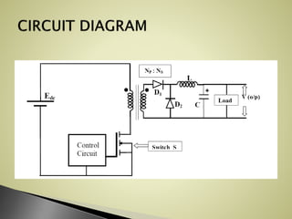 The forward converter uses a transformer to step up or down an input dc voltage and provide isolation for the load. It operates in two modes: when the switch is on, the input voltage is applied to the primary winding and power is transferred to the secondary winding and load; when the switch is off, the secondary inductor maintains current through a freewheeling diode. Key aspects of design include transformer turn ratio selection, inductor and capacitor sizing, and duty cycle adjustment for output voltage control. Benefits include better transformer utilization, filtered output, input-output isolation, and higher efficiency compared to flyback converters for power levels of 100-200 watts.