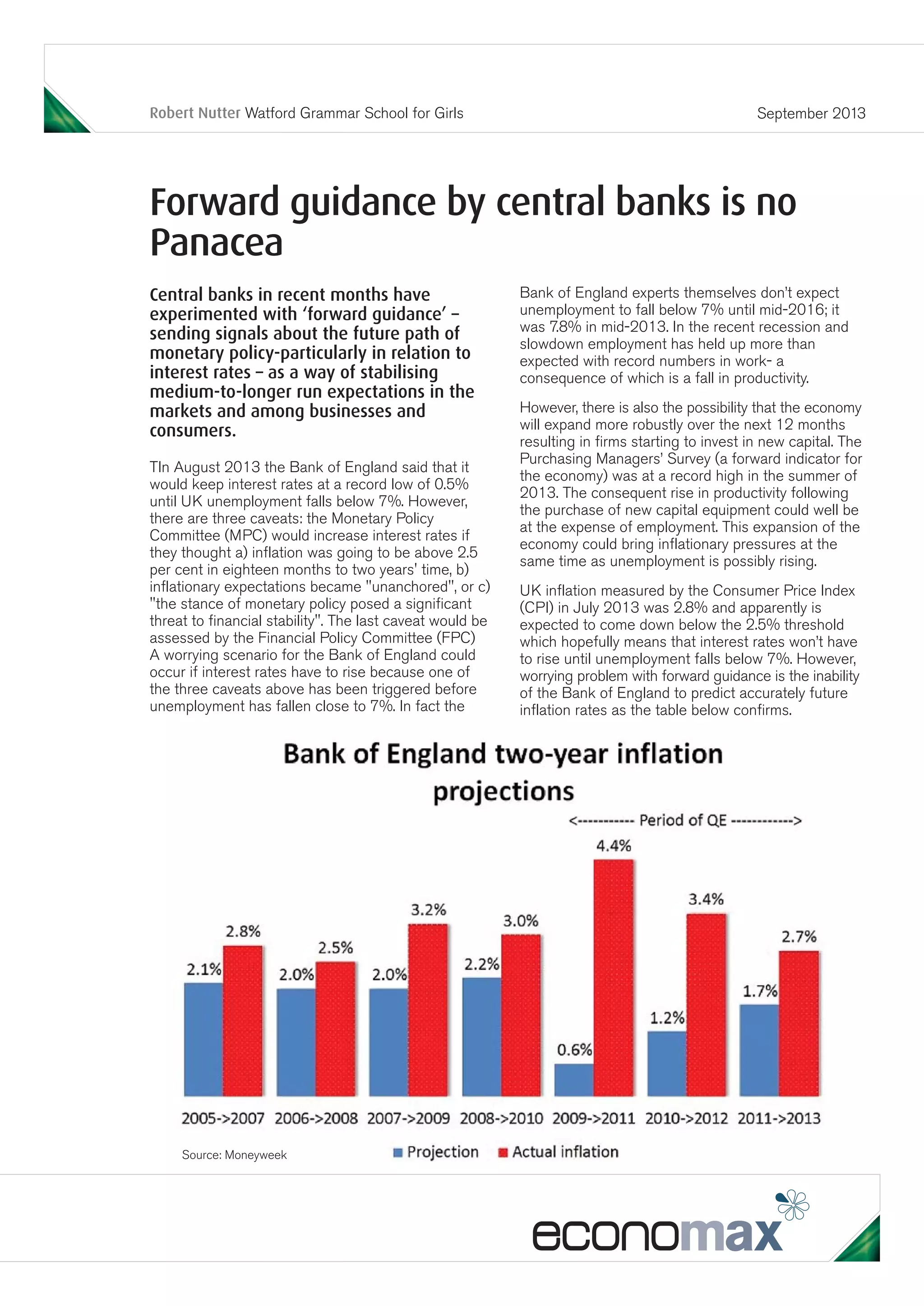 The document discusses the concept of 'forward guidance' in monetary policy, particularly by central banks like the Bank of England and the Federal Reserve, to stabilize market expectations regarding interest rates. It highlights the potential challenges of predicting future inflation and the risks associated with rising interest rates before unemployment falls to target levels. Ultimately, it concludes that while forward guidance can provide some stability, it is not a comprehensive solution to underlying economic issues.