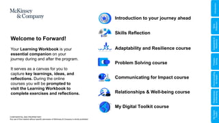 The document is a learning workbook for a professional development program offered by McKinsey & Company, focusing on skills such as adaptability, problem-solving, communication, and relationship-building. It includes exercises for participants to reflect on their learning intentions, prioritize skills, and develop habits that reinforce key behaviors for career advancement. Participants are encouraged to engage with content actively and apply structured approaches to personal and professional challenges.
