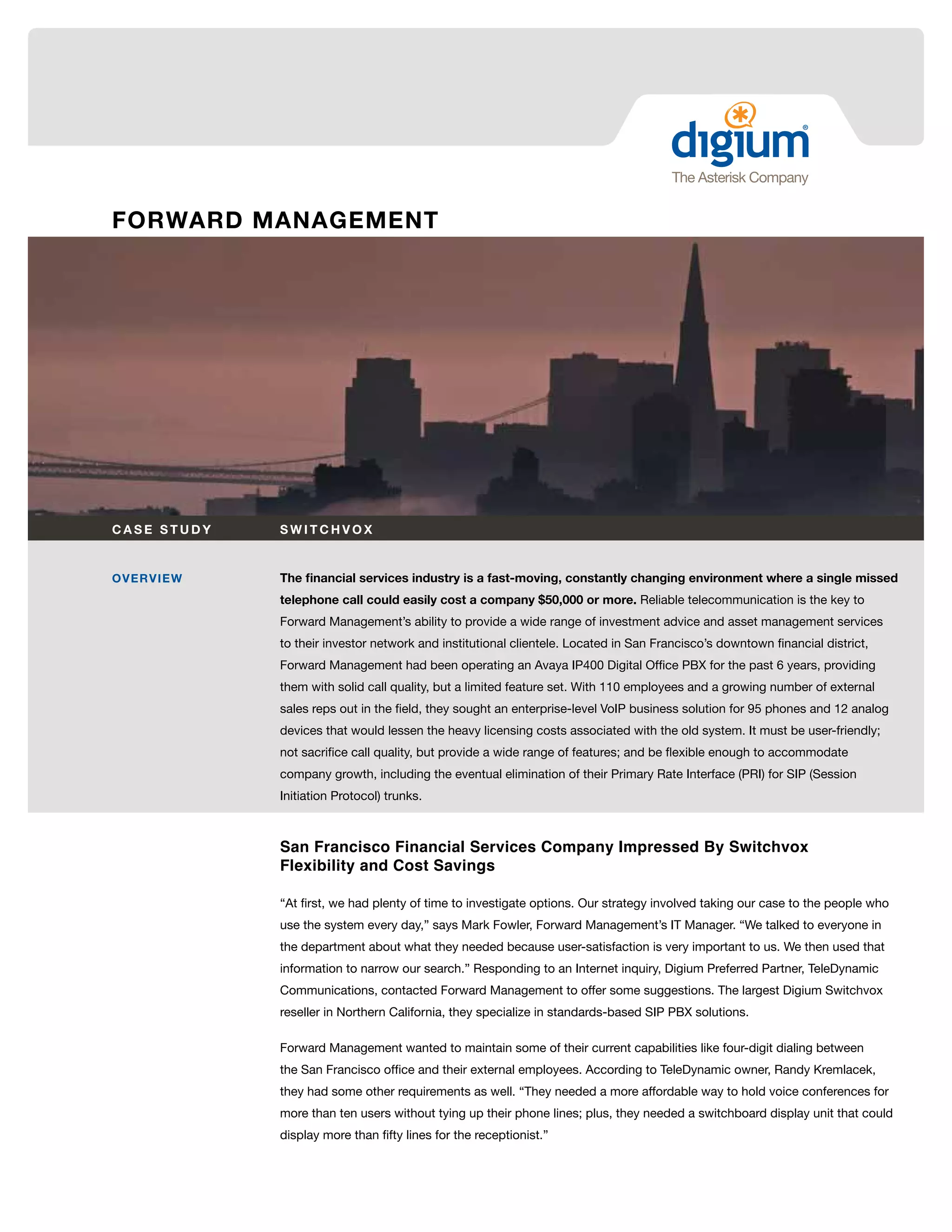 Forward Management, a financial services company, sought a user-friendly, cost-effective VoIP business solution to replace their outdated Avaya system and accommodate growth. After thorough evaluation, they chose the Digium Switchvox SMB due to its flexibility, cost savings, and positive user feedback, completing installation within a tight deadline. The new system enhances communication capabilities while addressing previous licensing and feature limitations, allowing for efficient management of telecom operations.