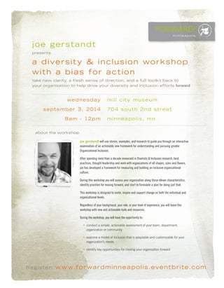 Joe Gerstandt is hosting a diversity and inclusion workshop aimed at providing participants with actionable tools and insights to enhance organizational inclusion, scheduled for September 3, 2014, at Mill City Museum in Minneapolis. The workshop will involve interactive assessments of organizational culture based on eleven characteristics and is designed for leaders, managers, and anyone interested in fostering inclusive environments. Attendees will receive a customizable framework, a comprehensive workbook, and access to additional resources to support their diversity and inclusion efforts.