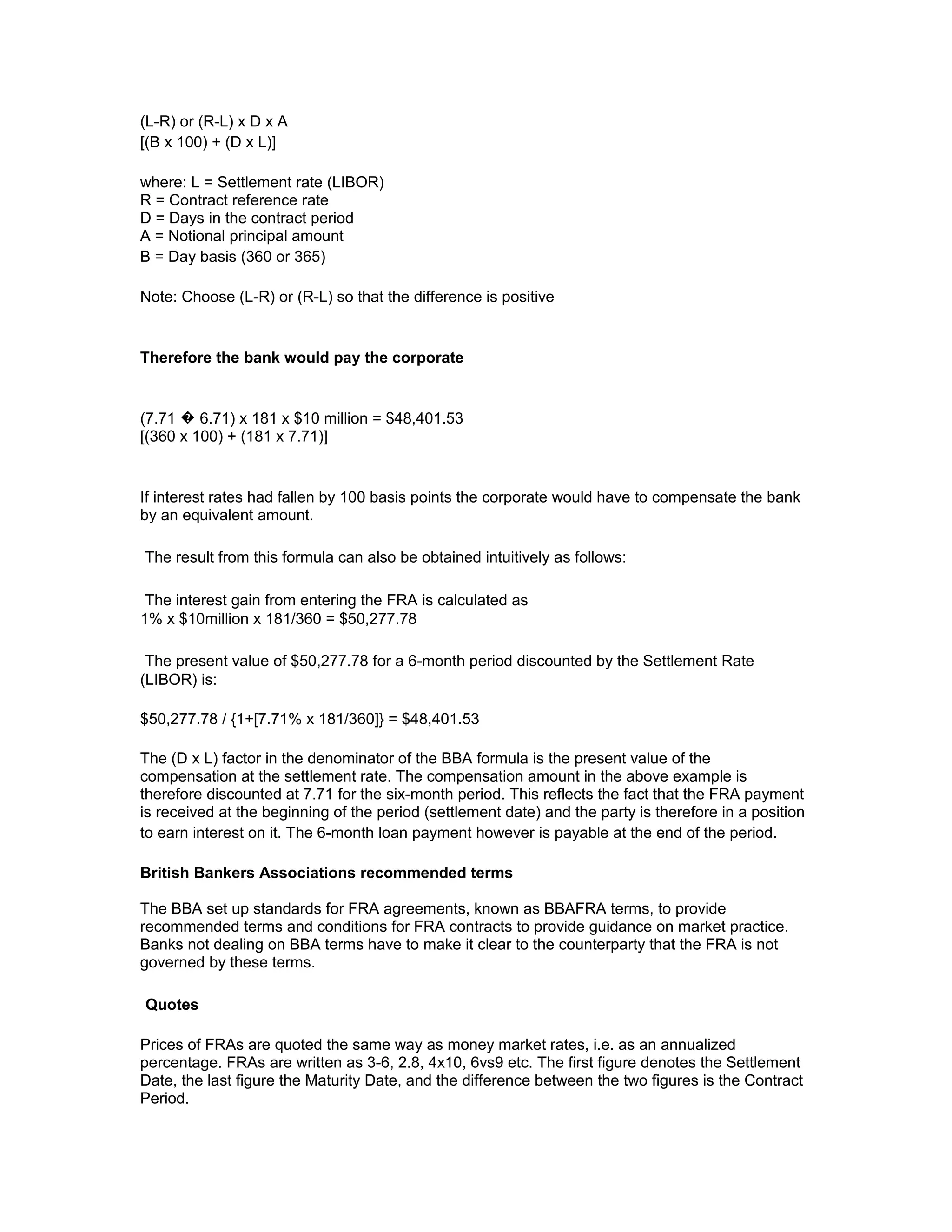 A Forward Rate Agreement (FRA) is a contract that establishes a fixed interest rate for a specified period between two parties, mainly used by banks for hedging against interest rate risks and speculative activities. FRAs are customized for specific needs and do not require initial margins or central clearing, with settlement reflecting the difference between the market and contract rates. The British Bankers' Association (BBA) provides standard terms for FRAs, and their applications include hedging, arbitrage, and speculation, with various types like strip FRAs and forward spread agreements becoming increasingly popular.