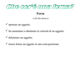 La forza è un concetto fisico che permette di spostare, accelerare, deformare o mantenere in posizione un oggetto. Il documento menziona Isaac Newton e il suo contributo alla comprensione delle forze, in particolare la gravità che fa cadere gli oggetti verso il basso.