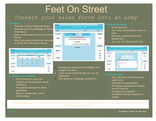 The document outlines a software application designed to enhance sales force productivity by utilizing a user-friendly interface and automated processes for managing client interactions and performance. Features include bulk email capabilities, personalized communication, progress tracking, and work allocation efficiencies. It allows for easy data updates and access control, making it suitable for a diverse range of users.