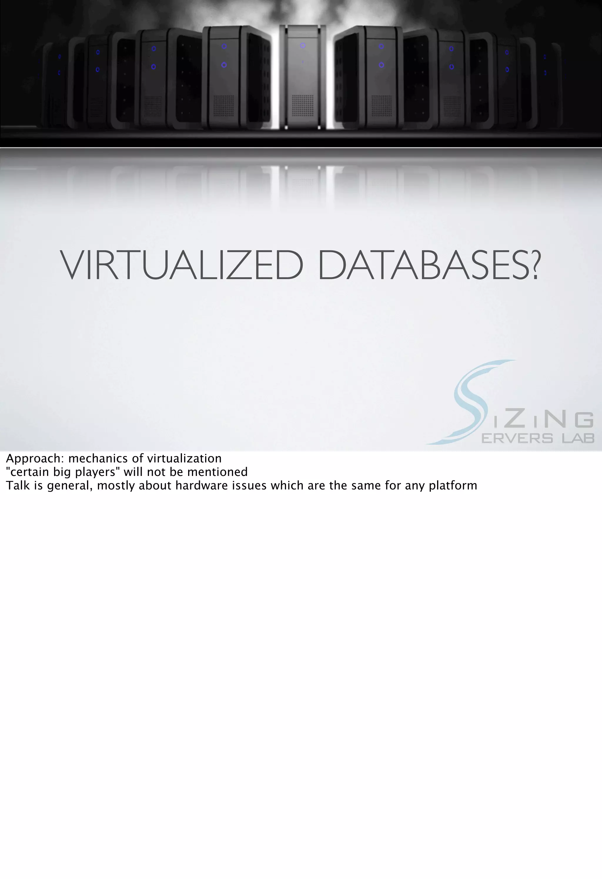 Virtualization is an old concept that provides abstraction and security through CPU execution modes and virtual memory management. There are two main challenges for virtualization - handling privileges and virtual memory address translation. Hardware virtualization techniques address these by introducing a hypervisor mode and advanced page table structures, improving performance over older binary translation methods. Database performance in virtualized environments is impacted by the overhead of interrupts, system calls, and memory management, so optimization techniques focus on reducing these costs through configuration tuning, hardware choices, and I/O isolation strategies.