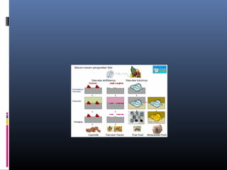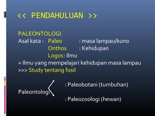 Dokumen ini membahas paleontologi sebagai ilmu yang mempelajari kehidupan masa lampau melalui fosil, termasuk klasifikasi fosil menjadi makrofossil dan mikrofossil. Berbagai jenis lingkungan hidup makhluk hidup dan bagaimana fosil terbentuk, serta syarat-syarat yang diperlukan untuk terjadinya fosilisasi, juga dijelaskan. Fosil memiliki peranan penting dalam memahami sejarah kehidupan di Bumi, termasuk penjelasan mengenai lingkungan sedimentasi yang baik untuk pengawetan organisme.