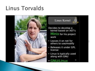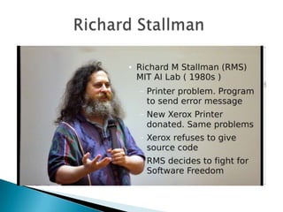 The document discusses the evolution of software from early computers, emphasizing the shift from a collaborative, open-source culture to proprietary models, particularly through the influence of Richard Stallman and Linus Torvalds. It contrasts the 'cathedral' and 'bazaar' development models, highlighting how open development increases bug-fixing efficiency and encourages community involvement in software creation. It also notes the rise of free and open source software (FOSS) in various countries and its impact on the economy and public sector.