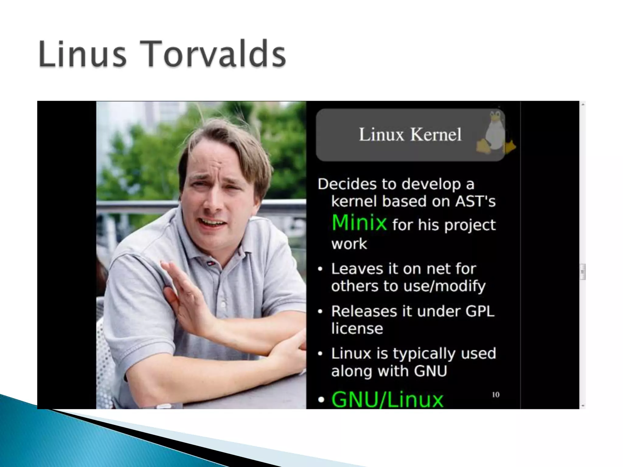 The document discusses the history and development of free and open source software (FOSS). It describes how early software was freely shared among academic institutions and companies. Richard Stallman founded the GNU project in 1983 to develop free software and started the free software movement. Linux, developed by Linus Torvalds, expanded interest in FOSS using an open "bazaar" development model. Eric Raymond's 1997 essay promoted this decentralized model and helped popularize Linux. The document also outlines India's support for FOSS through initiatives like the National Resource Center for Free and Open Source Software.