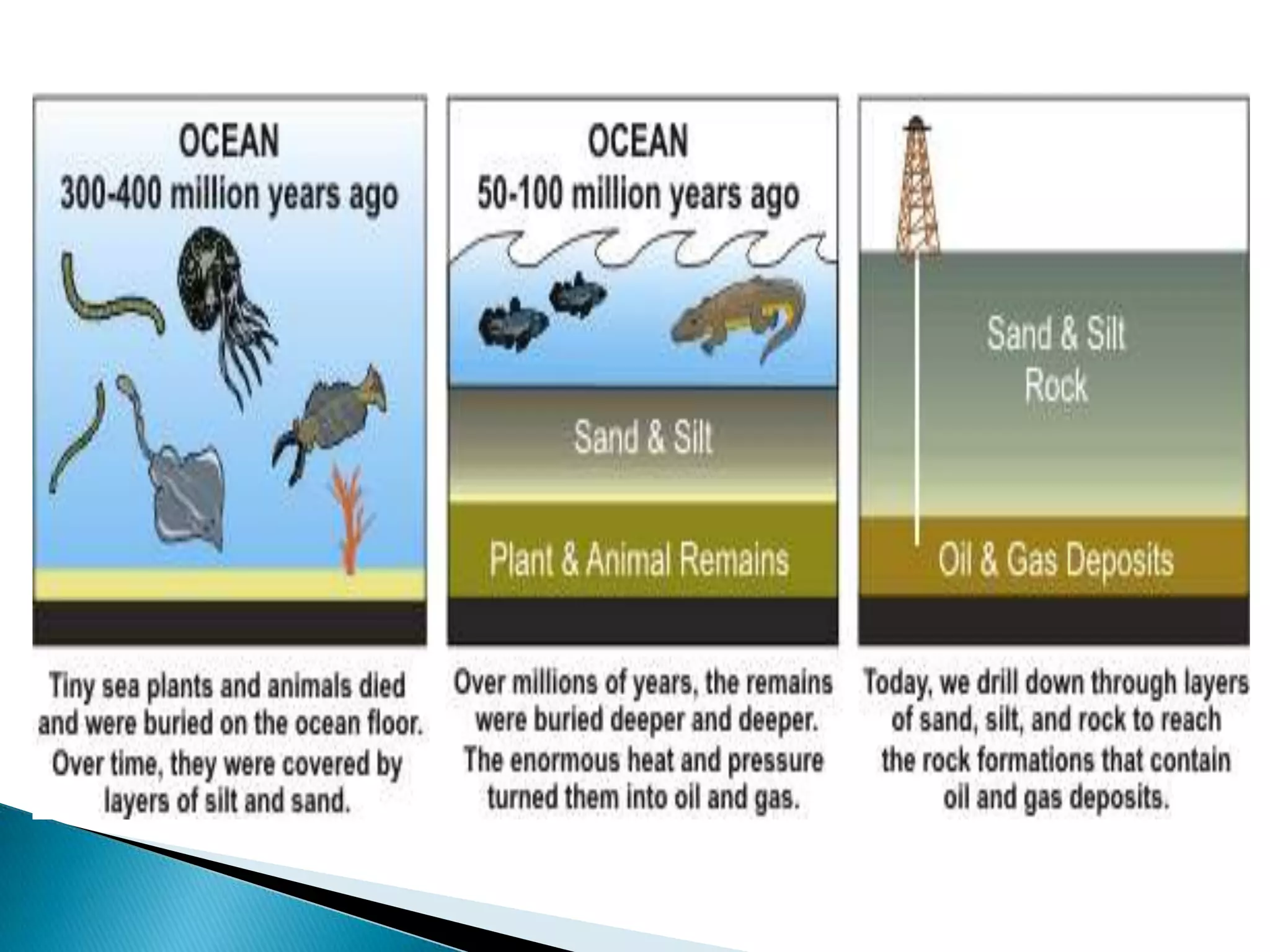 Fossil fuels such as petroleum, coal, and natural gas are nonrenewable energy resources formed from the remains of ancient plants and animals. Petroleum is a liquid fossil fuel that provides over 40% of the world's energy through gasoline and other products. Natural gas is a gaseous fossil fuel used mainly for heating and power generation, while coal is a solid fossil fuel that produces more air pollution but is still widely used by power plants. Fossil fuels form over millions of years from the compression of ancient biological material and are extracted through drilling or mining depending on the type and location underground or offshore.