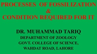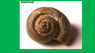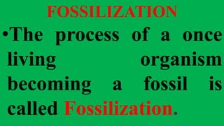 Fossilization requires three conditions: 1) The organism must have hard parts like bones or shells. 2) The remains must avoid immediate destruction after death. 3) Rapid burial is needed in sediment that prevents decomposition. There are four main types of fossilization - permineralization, replacement, carbonization, and traces. The fossil record is biased toward organisms with hard parts and rare environments like the Burgess Shale provided exceptional preservation of soft-bodied creatures.