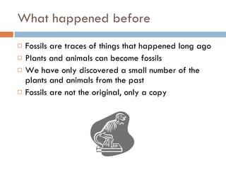 Fossils are traces of ancient plants and animals that have been replaced by minerals over time. They provide clues about past life, though we can never fully reconstruct ancient ecosystems. Fossils form when organisms are quickly buried and the remains are slowly replaced by minerals. Paleontologists and geologists search rock layers and excavate fossils to learn about dinosaurs, early mammals, and climates from clues across many fossil sites.