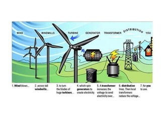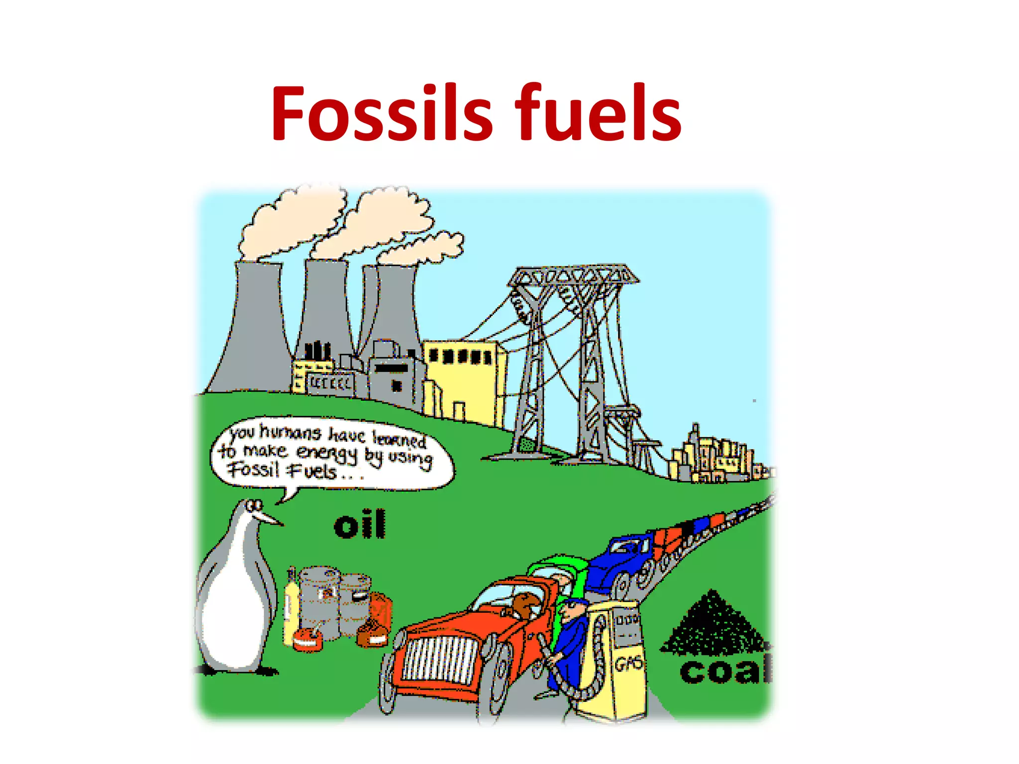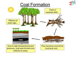 This document discusses different types of energy sources. It defines fossil fuels as fuels formed from the remains of decayed plants and animals, including coal, natural gas, and oil. Coal forms over millions of years from decayed plants buried in swamps. Oil forms deep underground from decayed animal remains and is pumped to the surface. The key difference between coal and oil is that coal comes from plants while oil comes from animals. Fossil fuels are non-renewable sources of energy that cannot be replaced once used up. Renewable energy sources include solar, wind, and hydropower, which can be replenished and used indefinitely.