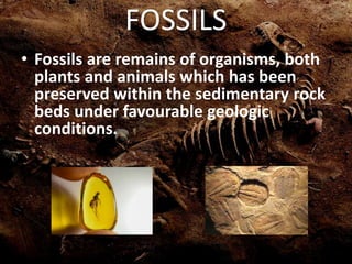 Fossils are preserved remains of organisms from the past. Fossilization occurs when organic material is transferred to rock through physical, chemical, and biological processes over long periods of time. For fossilization to be successful, favorable conditions are required such as rapid burial of organisms under thick sediment, which protects the remains from decay. Hard parts like shells and bones are more likely to fossilize than soft tissues. Fossilization can occur through various processes including preservation of original hard tissues, replacement through mineralization, or formation of molds and casts. Trace fossils in the form of tracks and trails can also provide evidence of ancient life.