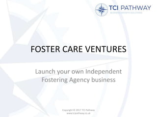 This document advertises launching your own independent fostering agency business through Foster Care Ventures. It states that with three years of experience working in foster care, they can help with starting, owning and running the business by providing full back-office support services, a guaranteed salary, and no upfront costs or financial outlay necessary. Interested individuals are instructed to contact Safaraz Ali via LinkedIn, Twitter, or telephone to begin a conversation.